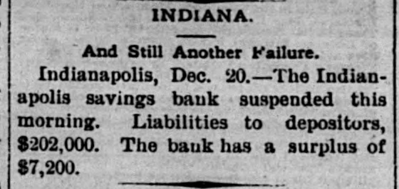 INDIANA. And Still Another Failure. Indianapolis, Dec. 20.-The Indianapolis savings bank suspended this morning. Liabilities to depositors, $202,000. The bauk has a surplus of $7,200.