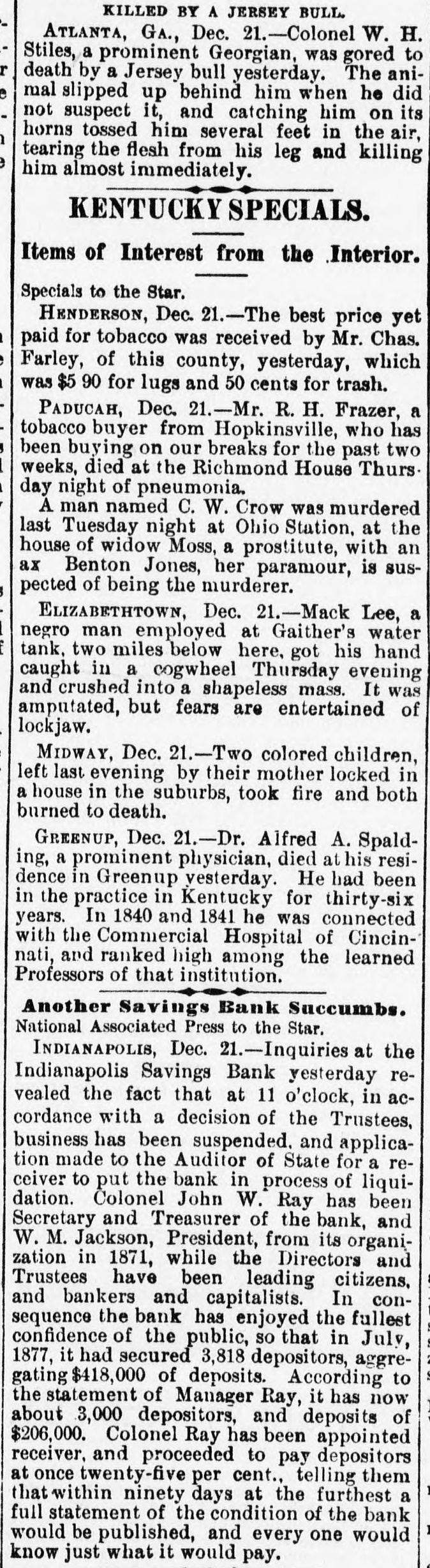 KILLED BY A JERSEY BULL. ATLANTA, GA., Dec. 21.-Colonel W. H. Stiles, a prominent Georgian, was gored to death by a Jersey bull yesterday. The anie mal slipped up behind him when he did not suspect it, and catching him on its horns tossed him several feet in the air, tearing the flesh from his leg and killing him almost immediately. KENTUCKY SPECIALS. Items of Interest from the Interior. Specials to the Star. HENDERSON, Dec. 21.-The best price yet paid for tobacco was received by Mr. Chas. Farley, of this county, yesterday, which was $5 90 for lugs and 50 cents for trash. PADUCAH, Dec. 21.-Mr. R. H. Frazer, a tobacco buyer from Hopkinsville, who has been buying on our breaks for the past two weeks, died at the Richmond House Thurs. day night of pneumonia. A man named C. W. Crow was murdered last Tuesday night at Ohio Station, at the house of widow Moss, a prostitute, with an ax Benton Jones, her paramour, is suspected of being the murderer. ELIZABETHTOWN, Dec. 21.-Mack Lee, a negro man employed at Gaither's water tank. two miles below here, got his hand caught in a cogwheel Thursday evening and crushed into a shapeless mass. It was amputated, but fears are entertained of lockjaw. MIDWAY, Dec. 21.-Two colored children, left last evening by their mother locked in a house in the suburbs, took fire and both burned to death. GREENUP, Dec. 21.-Dr. Alfred A. Spalding, a prominent physician, died at his residence in Greenup vesterday. He had been in the practice in Kentucky for thirty-six years. In 1840 and 1841 he was connected with the Commercial Hospital of Cincinnati, and ranked high among the learned Professors of that institution. Another Savings Bank Succumbs. National Associated Press to the Star. INDIANAPOLIS, Dec. 21.-Inquiries at the Indianapolis Savings Bank yesterday revealed the fact that at 11 o'clock, in accordance with a decision of the Trustees, business has been suspended. and application made to the Auditor of State for a receiver to put the bank in process of liquidation. Colonel John W. Ray has been Secretary and Treasurer of the bank, and W. M. Jackson, President, from its organization in 1871, while the Directors and Trustees have been leading citizens, and bankers and capitalists. In consequence the bank has enjoyed the fullest confidence of the public, so that in July, 1877, it had secured 3,818 depositors, aggregating $418,000 of deposits. According to the statement of Manager Ray, it has now about 3,000 depositors, and deposits of $206,000. Colonel Ray has been appointed receiver, and proceeded to pay depositors at once twenty-five per cent., telling them that within ninety days at the furthest a full statement of the condition of the bank would be published, and every one would know just what it would pay.