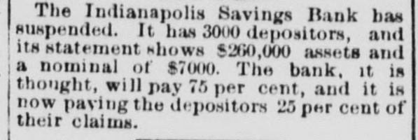 The Indianapolis Savings Bank has suspended. It has 3000 depositors, and its statement shows $260,000 assets and a nominal of $7000. The bank, it is thought, will pay 75 per cent, and it is now paying the depositors 25 per cent of their claims.