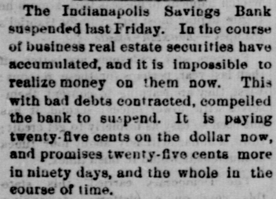 The Indianapolis Savings Bank suspended last Friday. In the course of business real estate securities have accumulated, and it is impossible to realize money on them now. This with bad debts contracted, compelled the bank to suspend. It is paying twenty-five cents on the dollar now, and promises twenty-five cents more in ninety days, and the whole in the course of time.