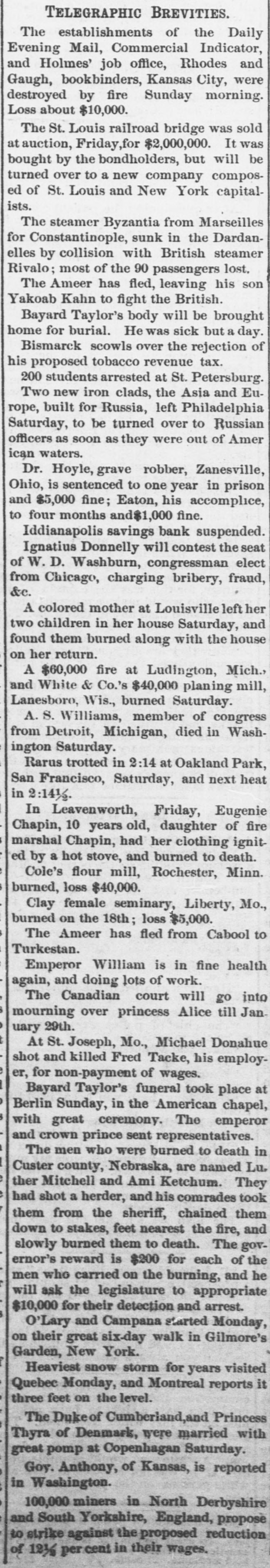 TELEGRAPHIC BREVITIES. The establishments of the Daily Evening Mail, Commercial Indicator, and Holmes' job office, Rhodes and Gaugh, bookbinders, Kansas City, were destroyed by fire Sunday morning. Loss about $10,000. The St. Louis railroad bridge was sold at auction, Friday,for $2,000,000. It was bought by the bondholders, but will be turned over to a new company composed of St. Louis and New York capitalists. The steamer Byzantia from Marseilles for Constantinople, sunk in the Dardanelles by collision with British steamer Rivalo; most of the 90 passengers lost. The Ameer has fled, leaving his son Yakoab Kahn to fight the British. Bayard Taylor's body will be brought home for burial. He was sick but a day. Bismarck scowls over the rejection of his proposed tobacco revenue tax. 200 students arrested at St. Petersburg. Two new iron clads, the Asia and Europe, built for Russia, left Philadelphia Saturday, to be turned over to Russian officers as soon as they were out of Amer ican waters. Dr. Hoyle, grave robber, Zanesville, Ohio, is sentenced to one year in prison and $5,000 fine; Eaton, his accomplice, to four months and$1,000 fine. Iddianapolis savings bank suspended. Ignatius Donnelly will contest the seat of W. D. Washburn, congressman elect from Chicago, charging bribery, fraud, &c. A colored mother at Louisville left her two children in her house Saturday, and found them burned along with the house on her return. A $60,000 fire at Ludington, Mich., and White & Co.'s $40,000 planing mill, Lanesboro, Wis., burned Saturday. A. S. Williams, member of congress from Detroit, Michigan, died in Washington Saturday. Rarus trotted in 2:14 at Oakland Park, San Francisco, Saturday, and next heat in 2:141/2. In Leavenworth, Friday, Eugenie Chapin, 10 years old, daughter of fire marshal Chapin, had her clothing ignited by a hot stove, and burned to death. Cole's flour mill, Rochester, Minn. burned, loss $40,000. Clay female seminary, Liberty, Mo., burned on the 18th; loss $5,000. The Ameer has fled from Cabool to Turkestan. Emperor William is in fine health again, and doing lots of work. The Canadian court will go into mourning over princess Alice till January 29th. At St. Joseph, Mo., Michael Donahue shot and killed Fred Tacke, his employer, for non-payment of wages. Bayard Taylor's funeral took place at Berlin Sunday, in the American chapel, with great ceremony. The emperor and crown prince sent representatives. The men who were burned to death in Custer county, Nebraska, are named Lu. ther Mitchell and Ami Ketchum. They had shot a herder, and his comrades took them from the sheriff, chained them down to stakes, feet nearest the fire, and slowly burned them to death. The governor's reward is $200 for each of the men who carried on the burning, and he will ask the legislature to appropriate $10,000 for their detection and arrest. O'Lary and Campana started Monday, on their great six-day walk in Gilmore's Garden, New York. Heaviest snow storm for years visited Quebec Monday, and Montreal reports it three feet on the level. The Duke of Cumberland,and Princess Thyra of Denmark. were married with