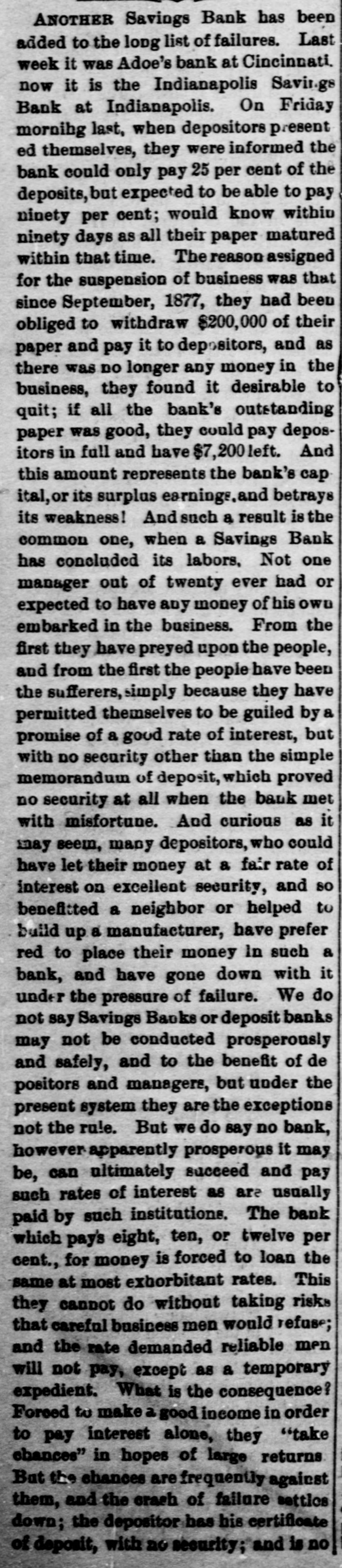 ANOTHER Savings Bank has been added to the long list of failures. Last week it was Adoe's bank at Cincinnati. now it is the Indianapolis Savings Bank at Indianapolis. On Friday mornihg last, when depositors present ed themselves, they were informed the bank could only pay 25 per cent of the deposits, but expected to be able to pay ninety per cent; would know within ninety days as all their paper matured within that time. The reason assigned for the suspension of business was that since September, 1877, they had been obliged to withdraw $200,000 of their paper and pay it to depositors, and as there was no longer any money in the business, they found it desirable to quit; if all the bank's outstanding paper was good, they could pay depositors in full and have $7,200 left. And this amount represents the bank's cap ital, or its surplus earnings, and betrays its weakness! And such a result is the common one, when a Savings Bank has concluded its labors, Not one manager out of twenty ever had or expected to have any money of his own embarked in the business. From the first they have preyed upon the people, and from the first the people have been the sufferers, simply because they have permitted themselves to be guiled by a promise of a good rate of interest, but with no security other than the simple memorandum of deposit, which proved no security at all when the bank met with misfortune. And curious as it may seem, many depositors, who could have let their money at a fair rate of interest on excellent security, and so benefitted a neighbor or helped to build up a manufacturer, have prefer red to place their money In such a bank, and have gone down with it under the pressure of failure. We do not say Savings Banks or deposit banks may not be conducted prosperously and safely, and to the benefit of de positors and managers, but under the present system they are the exceptions not the rule. But we do say no bank, however apparently prosperous it may be, can ultimately succeed and pay such rates of interest as are usually paid by such institutions. The bank which pay's eight, ten, or twelve per cent., for money is forced to loan the same at most exhorbitant rates. This they cannot do without taking risks that careful business men would refuse; and the rate demanded reliable men will not pay, except as a temporary expedient. What is the consequence? Forced to make a good income in order to pay interest alone, they "take chances" in hopes of large returns But the chances are frequently against them, and the crach of failure settles down; the depositor has his certificate of deposit, with no security; and is no