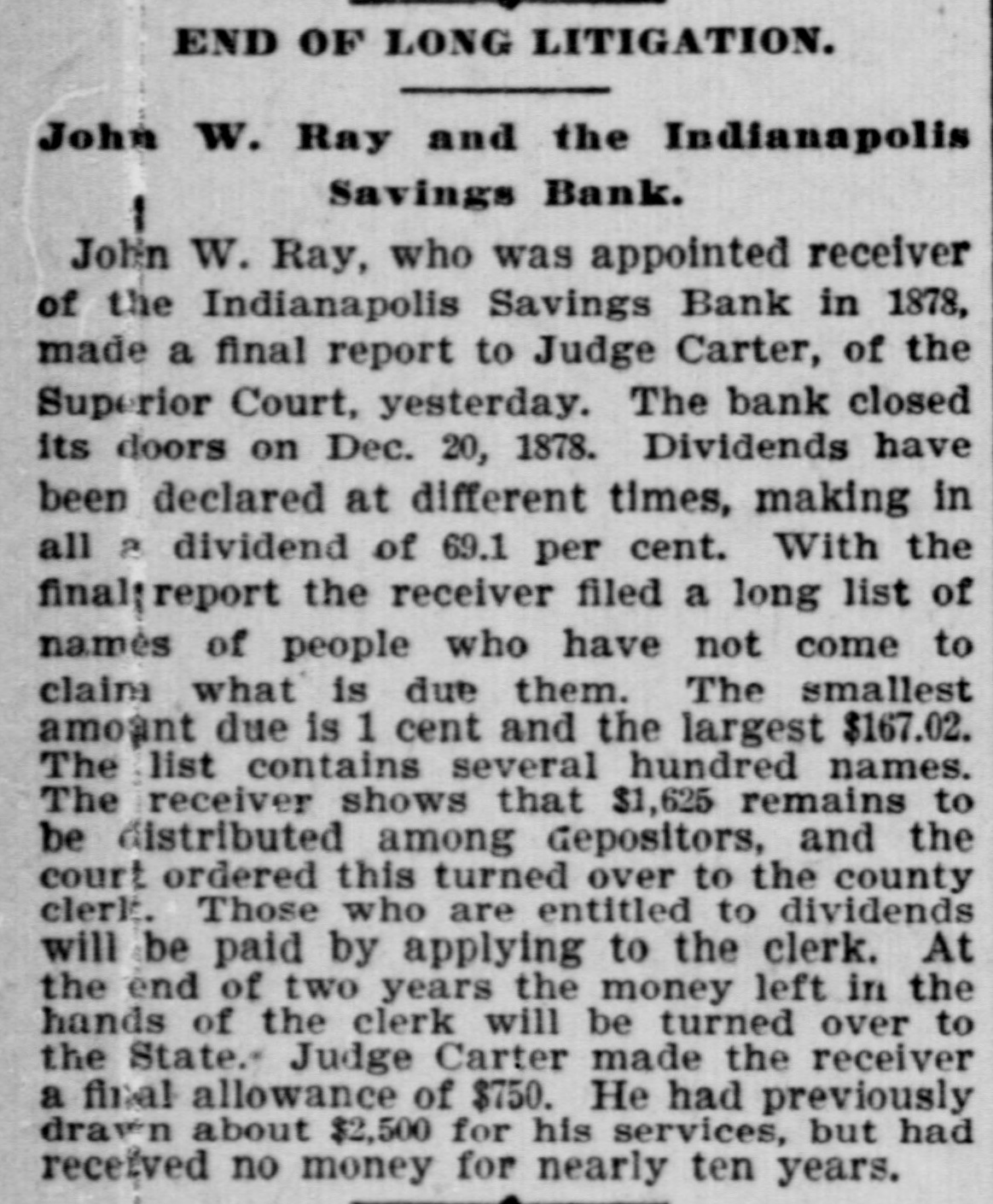 END OF LONG LITIGATION. John W. Ray and the Indianapolis Savings Bank. I John W. Ray, who was appointed receiver of the Indianapolis Savings Bank in 1878, made a final report to Judge Carter, of the Superior Court, yesterday. The bank closed its doors on Dec. 20, 1878. Dividends have been declared at different times, making in all a dividend of 69.1 per cent. With the final{report the receiver filed a long list of names of people who have not come to claim what is due them. The smallest amoant due is 1 cent and the largest $167.02. The list contains several hundred names. The receiver shows that $1,625 remains to be distributed among Gepositors, and the court ordered this turned over to the county clerk. Those who are entitled to dividends will be paid by applying to the clerk. At the end of two years the money left in the hands of the clerk will be turned over to the State. Judge Carter made the receiver a final allowance of $750. He had previously drawn about $2,500 for his services, but had received no money for nearly ten years.