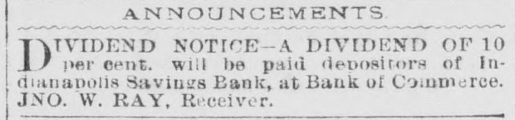 ANNOUNCEMENTS. IVIDEND NOTICE-A DIVIDEND OF 10 D per cent. will be paid depositors of Indianapolis Savings Bank, at Bank of Commerce. JNO. W. RAY, Receiver.