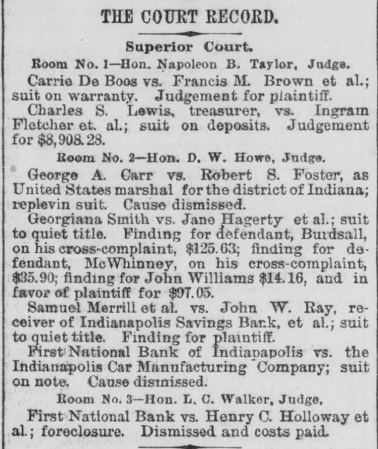# THE COURT RECORD. Superior Court. Room No. 1-Hon. Napoleon B. Taylor, Judge. Carrie De Boos vs. Francis M. Brown et al.; suit on warranty. Judgement for plaintiff. Charles S. Lewis, treasurer, vs. Ingram Fletcher et. al.; suit on deposits. Judgement for $8,908.28. Room No. 2-Hon. D. W. Howe, Judge. George A. Carr vs. Robert S. Foster, as United States marshal for the district of Indiana; replevin suit. Cause dismissed. Georgiana Smith vs. Jane Hagerty et al.; suit to quiet title. Finding for defendant, Burdsall, on his cross-complaint, $125.63; finding for defendant, McWhinney, on his cross-complaint, $35.90; finding for John Williams $14.16, and in favor of plaintiff for $97.05. Samuel Merrill et al. vs. John W. Ray, receiver of Indianapolis Savings Bank, et al.; suit to quiet title. Finding for plaintiff. First National Bank of Indianapolis vs. the Indianapolis Car Manufacturing Company; suit on note. Cause dismissed. Room No. 3-Hon. L. C. Walker, Judge, First National Bank vs. Henry C. Holloway et al.; foreclosure. Dismissed and costs paid.