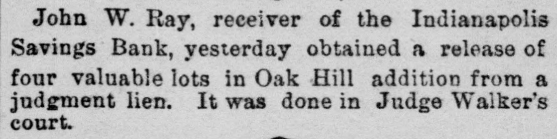 John W. Ray, receiver of the Indianapolis Savings Bank, yesterday obtained a release of four valuable lots in Oak Hill addition from a judgment lien. It was done in Judge Walker's court.
