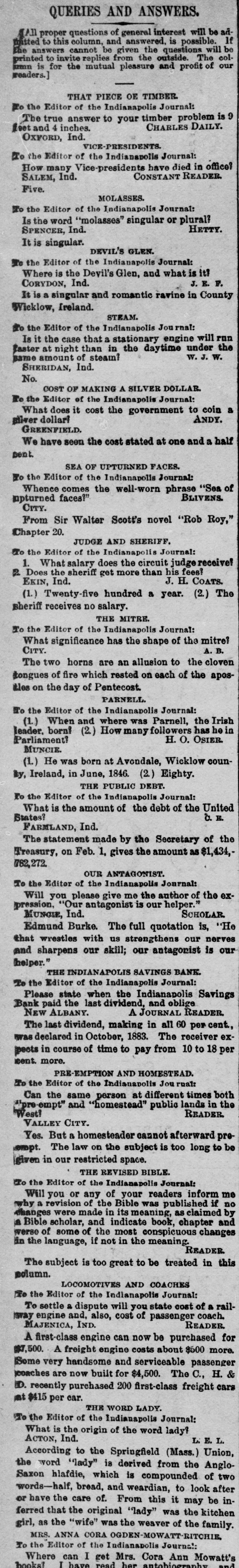 QUERIES AND ANSWERS. (All proper questions of general interest will be admitted to this column, and answered. is possible. If the answers cannot be given the questions will be printed to invite replies from the outside. The colarmn is for the mutual pleasure and profit of our readers.] THAT PIECE OE TIMBER. To the Editor of the Indianapolis Journal: The true answer to your timber problem is 9 CHARLES DAILY. feet and 4 inches. OXFORD, Ind. VICE-PRESIDENTS. To the Editor of the Indianapolis Journal: How many Vice-presidents have died in office? CONSTANT READER. SALEM, Ind. Five. MOLASSES. To the Editor of the Indianapolis Journal: Is the word "molasses" singular or plural? HETTY. SPENCER, Ind. It is singular. DEVIL'S GLEN. To the Editor of the Indianapolis Journal: Where is the Devil's Glen, and what is it? J. E. F. CORYDON, Ind. It is a singular and romantic ravine in County Wicklow, Ireland. STEAM. To the Editor of the Indianapolis Journal: Is it the case that a stationary engine will run Easter at night than in the daytime under the W. J. W. same amount of steam? SHERIDAN, Ind. No. COST OF MAKING A SILVER DOLLAR. To the Editor of the Indianapolis Journal: What does it cost the government to coin a ANDY. gilver dollar? GREENFIELD. We have seen the cost stated at one and a half sent. SEA OF UPTURNED FACES. To the Editor of the Indianapolis Journal: Whence comes the well-worn phrase "Sea of BLIVENS. npturned faces?" CITY. From Sir Walter Scott's novel "Rob Roy," Chapter 20. JUDGE AND SHERIFF. To the Editor of the Indianapolis Journal: 1. What salary does the circuit judgereceive! 2 Does the sheriff get more than his fees! J. H. COATS. EKIN, Ind. (1.) Twenty-five hundred a year. (2.) The sheriff receives no salary. THE MITRE. To the Editor of the Indianapolis Journal: What significance has the shape of the mitre? CITY. A.B. The two horns are an allusion to the cloven tongues of fire which rested on each of the aposthes on the day of Pentecost. PARNELL. To the Editor of the Indianapolis Journal: (1) When and where was Parnell, the Irish leader, born! (2) How many followers has he in H. O. OSIER. Parliament? MUNCIE. (1.) He was born at Avondale, Wicklow counBy, Ireland, in June, 1846. (2) Eighty. THE PUBLIC DEBT. To the Editor of the Indianapolis Journal: What is the amount of the debt of the United b. E. States? FARMLAND, Ind. The statement made by the Secretary of the Treasury, on Feb. 1, gives the amount as $1,434,782,272. OUR ANTAGONIST. To the Editor of the Indianapolis Journal: Will you please give me the author of the expression, "Our antagonist is our helper." SCHOLAR. MUNCIE, Ind. Edmund Burke. The full quotation is, "He that wrestles with us strengthens our nerves and sharpens our skill; our antagonist is our helper." THE INDIANAPOLIS SAVINGS BANK. To the Editor of the Indianapolis Journal: Please state when the Indianapolis Savings Bank paid the last dividend, and oblige NEW ALBANY. A JOURNAL READER. The last dividend, making in all 60 per cent., was declared in October, 1883. The receiver expects in course of time to pay from 10 to 18 per cent. more. PRE-EMPTION AND HOMESTEAD. To the Editor of the Indianapolis Jou rual: Can the same person at different times both "pre-empt" and "homestead" public lands in the West? READER. VALLEY CITY. Yes. But a homesteader cannot afterward preempt. The law on the subject is too long to be given in our restricted space. THE REVISED BIBLE. To the Editor of the Indianapolis Journal: Will you or any of your readers inform me why a revision of the Bible was published if no changes were made in its meaning, as claimed by a Bible scholar, and indicate book, chapter and werse of some of the most conspicuous changes in the language, if not in the meaning. READER. The subject is too great to be treated in this solumn. LOCOMOTIVES AND COACHES To the Editor of the Indianapolis Journal: To settle a dispute will you state cost of a railaway engine and, also, cost of passenger coach. READER. MAJENICA, IND. A first-class engine can now be purchased for $7,500. A freight engine costs about $500 more. Some very handsome and serviceable passenger seonches are now built for $4,500. The C., H. & D. recently purchased 200 first-class freight cars at $415 per car. THE WORD LADY. To the Editor of the Indianapolis Journal: What is the origin of the word lady? ACTON, Ind. L. E. L. According to the Springfield (Mass.) Union, the word "lady" is derived from the AngloSaxon hlafdie, which is compounded of two words-half, bread, and weardian, to look after or have the care of. From this it may be inferred that the original "lady" was the kitchen girl, as the "wife" was the weaver of the family. MRS. ANNA CORA OGDEN-MOWATT-RITCHIE,
