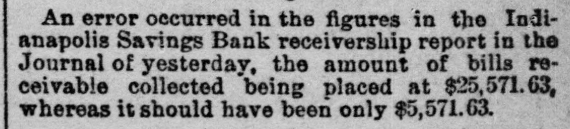 An error occurred in the figures in the Indianapolis Savings Bank receivership report in the Journal of yesterday, the amount of bills receivable collected being placed at $25,571.63, whereas it should have been only $5,571.63.