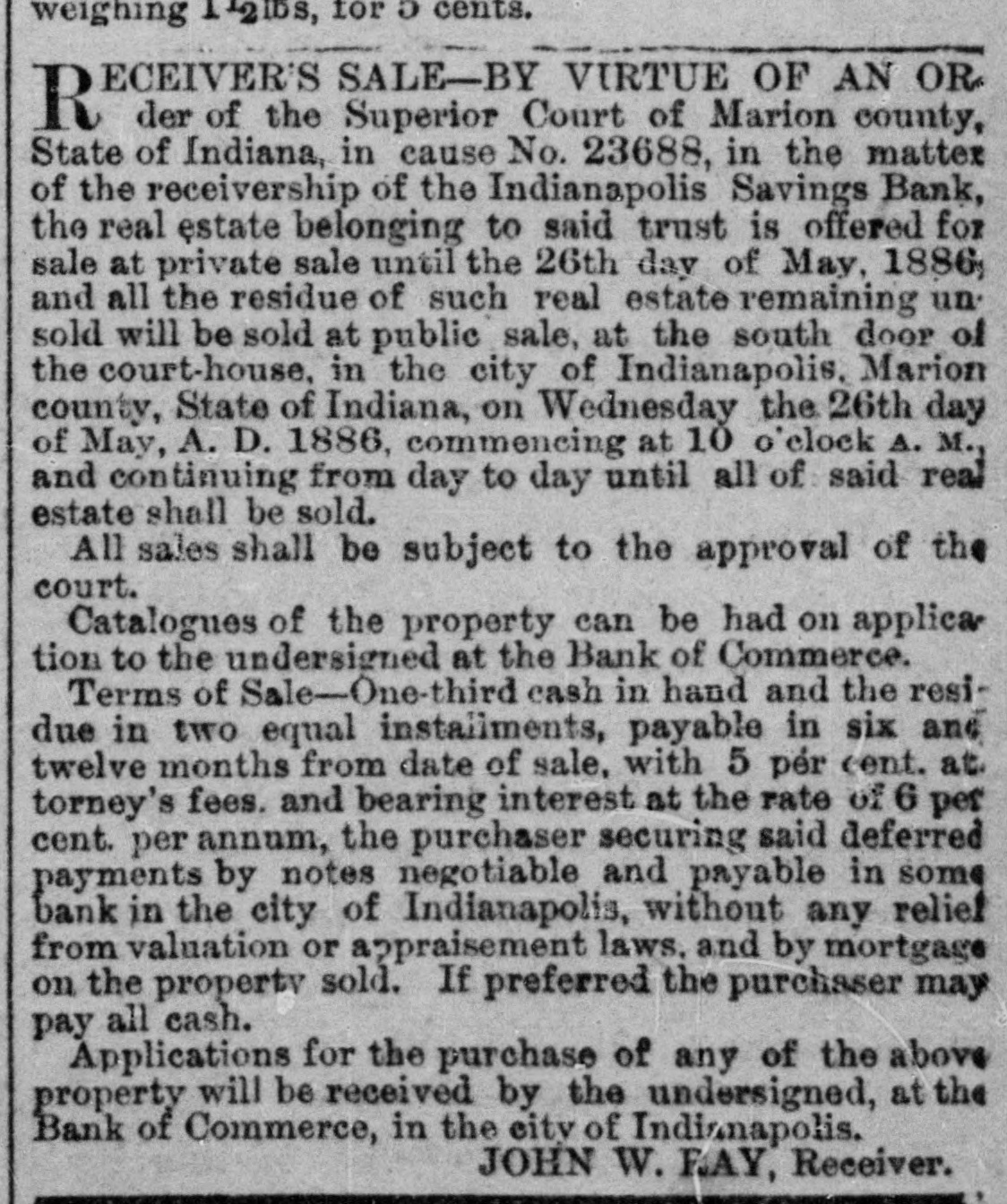 weighing 1-2lbs, for a cents. ECEIVER'S SALE-BY VIRTUE OF AN OR R der of the Superior Court of Marion county, State of Indiana, in cause No. 23688, in the matter of the receivership of the Indianapolis Savings Bank, the real estate belonging to said trust is offered for sale at private sale until the 26th day of May, 1886, and all the residue of such real estate remaining un. sold will be sold at public sale, at the south door of the court-house, in the city of Indianapolis, Marion county, State of Indiana, on Wednesday the 26th day of May, A. D. 1886, commencing at 10 'clock A. M., and continuing from day to day until all of said real estate shall be sold. All sales shall be subject to the approval of the court. Catalogues of the property can be had on applica tion to the undersigned at the Bank of Commerce. Terms of Sale-One-third cash in hand and the residue in two equal installments, payable in six and twelve months from date of sale, with 5 pér cent. at. torney's fees. and bearing interest at the rate of 6 per cent. per annum, the purchaser securing said deferred payments by notes negotiable and payable in some bank in the city of Indianapolis, without any relief from valuation or appraisement laws, and by mortgage on the property sold. If preferred the purchaser may pay all cash. Applications for the purchase of any of the above property will be received by the undersigned, at the Bank of Commerce, in the city of Indianapolis. JOHN W. FAY, Receiver.