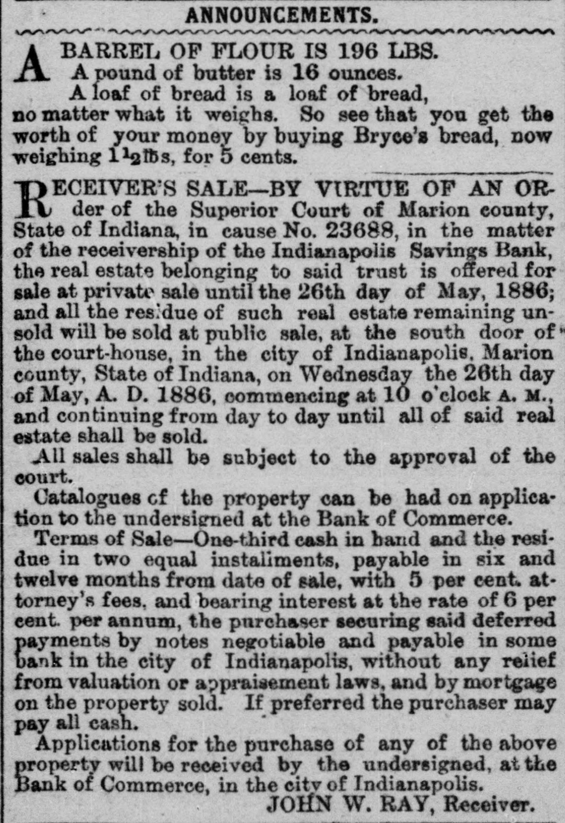 ANNOUNCEMENTS. BARREL OF FLOUR IS 196 LBS. A A pound of butter is 16 ounces. A loaf of bread is a loaf of bread, no matter what it weighs. So see that you get the worth of your money by buying Bryce's bread, now weighing 112tbs, for 5 cents. ECEIVER'S SALE-BY VIRTUE OF AN ORR der of the Superior Court of Marion county, State of Indiana, in cause No. 23688, in the matter of the receivership of the Indianapolis Savings Bank, the real estate belonging to said trust is offered for sale at private sale until the 26th day of May, 1886; and all the residue of such real estate remaining unsold will be sold at public sale, at the south door of the court-house, in the city of Indianapolis, Marion county, State of Indiana, on Wednesday the 26th day of May, A. D. 1886, commencing at 10 o'clock A. M., and continuing from day to day until all of said real estate shall be sold. All sales shall be subject to the approval of the court. Catalogues of the property can be had on application to the undersigned at the Bank of Commerce. Terms of Sale-One-third cash in hand and the residue in two equal instaliments, payable in six and twelve months from date of sale, with 5 per cent. attorney's fees, and bearing interest at the rate of 6 per cent. per annum, the purchaser securing said deferred payments by notes negotiable and payable in some bank in the city of Indianapolis, without any relief from valuation or appraisement laws, and by mortgage on the property sold. If preferred the purchaser may pay all cash. Applications for the purchase of any of the above property will be received by the undersigned, at the Bank of Commerce, in the city of Indianapolis. JOHN W. RAY, Receiver.