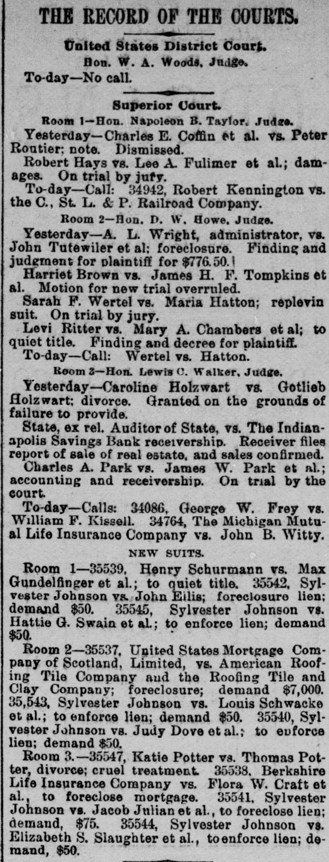 THE RECORD OF THE COURTS. United States District Court. Bon. W. A. Woods. Judge. To-day-No call. Superior Court. Room 1-Hon. Napoleon B. Taylor. Judge. Yesterday-Charles E. Coffin et al. vs. Peter Routier; note. Dismissed. Robert Hays VS. Lee A. Fulimer et al.; damages. On trial by jufy. To-day-Call: 34942, Robert Kennington vs. the C., St. L. & P. Railroad Company. Room 2-Hon. D. W. Howe. Judge. Yesterday-A. L. Wright, administrator, vs. John Tutewiler et al: foreclosure. Finding and judgment for plaintiff for $776.50.1 Harriet Brown vs. James H. F. Tompkins et al. Motion for new trial overruled. Sarah F. Wertel vs. Maria Hatton; replevin suit. On trial by jury. Levi Ritter vs. Mary A. Chambers et al; to quiet title. Finding and decree for plaintiff. To-day-Call: Wertel vs. Hatton. Room 3-Hon. Lewis C. Walker, Judge. Yesterday-Caroline Holzwart VS. Gotlieb Holzwart: divorce. Granted on the grounds of failure to provide. State, ex rel. Auditor of State, vs. The Indianapolis Savings Bank receivership. Receiver files report of sale of real estate, and sales confirmed. Charles A. Park vs. James W. Park et al.; accounting and receivership. On trial by the court. To-day-Calls: 34086, George W. Frey vs. William F. Kissell. 34764, The Michigan Mutual Life Insurance Company vs. John B. Witty. NEW SUITS. Room 1-35539, Henry Schurmann VS. Max Gundelfinger et al.; to quiet title. 35542, Sylvester Johnson VS. John Eilis; foreclosure lien; demand $50. 35545, Sylvester Johnson vs. Hattie G. Swain et al.; to enforce lien; demand $50. Room 2-35537, United States Mortgage Company of Scotland, Limited, vs. American Roofing Tile Company and the Roofing Tile and Clay Company; foreclosure; demand $7,000. 35,543, Sylvester Johnson vs. Louis Schwacke et al.; to enforce lien; demand $50. 35540, Sylvester Johnson VS. Judy Dove et al.; to enforce lien; demand $50. Room 3.-35547, Katie Potter VS. Thomas Potter, divorce; cruel treatment. 35538, Berkshire Life Insurance Company vs. Flora W. Craft et al., to foreclose mortgage. 35541, Sylvester Johnson vs. Jacob Julian et al., to foreclose lien; demand, $75. 35544, Sylvester Johnson vs. Elizabeth S. Slaughter et al., toenforce lien; demand, $50.