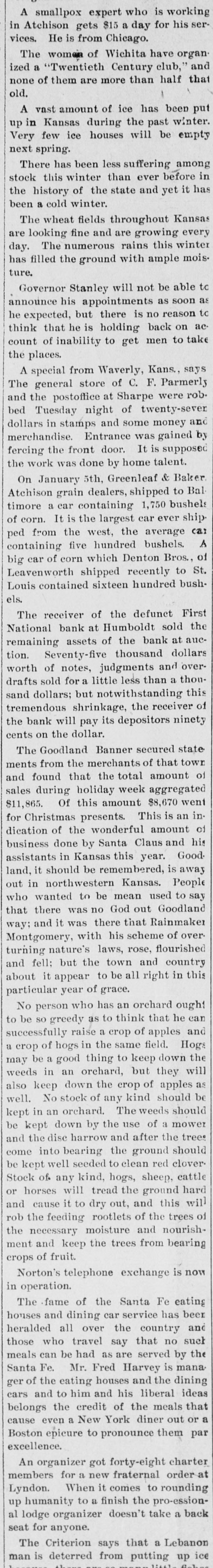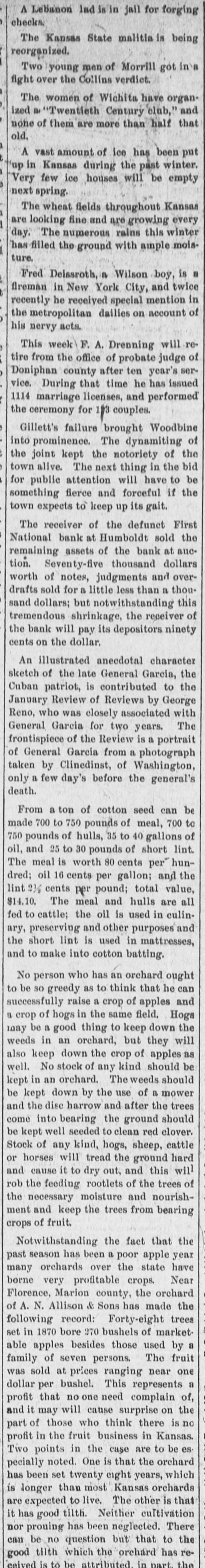 KANSAS STATE NEWS. The city hospital at Pittsburg has been sold to the Catholics Abilene ministers have begun a erΓΌsade against slot machines and raffles Pearl Bullock, a 17-year-old Lawrence girl, was mysteriously missing. Mrs. Adam Harris, of Paola, is the mother of 14 children, the oldest of whom is but 15. A state militia company of 46 members was organized in Yates Center with F. W: Butler eaptain. On the last day of 1898 the Baptists at Peabody held special services and burned the mortgage on their church. It was officially announced that Henry J. Allen, of the Ottawa Herald, had been selected as private secretary to Gov-elect Stanley. Raymond Carr, aged 18, of Sedan, was drowned while skating on Caney river. He went through into four feet of water and slid under the ice. Jay Simpson, a traveling soap fake artist. and Mrs. Spence, who eloped from Eureka, were captured at Moline by officers and taken back to Eureka An unknown disease was raging among Weir City children. A half dozen deaths resulted, none of the children being sick more than four hours. The departure of Mrs. Grant Gillett from Woodbine to join her husband in Old Mexico caused the running of several attachments on her property in Dickinson county. W. B. Yates, the young business man who disappeared from Larned two weeks ago under cloud, was found in a hospital at Oakland, Cal., suffering from brain trouble. Norman Palmer and wife, who were married in McGrawville, N. Y., January 5, 1834, celebrated their sixty-fifth wedding anniversary at Nortonville on January 3, 1899. Galena is now the center of the greatest zinc ore-producing district in the world. Her output in 1898 was valued at $3,247,004, surpassing the Joplin district about one-half. Gov. and Mrs. Stanley were given reception in the First Methodist church at Wiehita on the eve of their departure for the state capital. Two thousand people shoolt the governor's hand. In his last call for a statement of the conditions of Kansas banks, Bank Commissioner Briedenthal requires each bank to return a statement of the amount and character of cattle paper on hand. Chancellor Snow's bulletin on 1898 weather in Kansas saysi During the years' record only two have had more snow than 1898, only three have had more rain and no other year has had of wind David Munday, defeated republican candidate for the legislature from the Eighth representative district, Leavenworth county, will contest the election of Matt Edmunds, fusionist, whose majority was is. Minnie Grisham, aged 14, of Galena, was burned to a crisp from her ankles her neck. She was cooking doughnuts, when the grease caught fire and the flames ignited her clothes. Her physician said she could not recove. Mrs. Nora Finnegan, aged 10: years, died the other day at her home in Good Intent, Atchison county. She was left a widow in Ireland 50 years ago and soon after sailed for America with her children. It was always Mrs. Finnegan's boast that she never had to call a physician. Many of the ex-county officers in the 21 counties in Kansas, whose special fees and salaries laws are said to have never been voted upon by the legislature, though they have been in effect since 1895, are arranging to bring suit to recover the amount of the reduction effected in their respective salaries. Rev. J. P. Aelmore, a Swedish pastor at Hutchinson, upon his return home from an out-of-town visit, found several sticks of dynamite in his heating stove, which he claims were placed there by enemies. Rev. Aelmore is bachelor and recently wrestled in court with a breach of promise suit. Mrs. Fred Bingor, of Galena, while slightly demented, strolled away from home, and when found was clinging to the rotten cribbing in an aban doned mine. She had fallen into the shaft, a distance of 100 feet, and ceived no injuries whatever save shock which restored her lost memory. A Topeka telegram said: The Kansas butter-makers will go before the legislature and demand protection against the manufacturers of oleomargarine, who are placing their product on the Kansas market. Though the creamery industry has grown nearly 100 per cent. in Kansas since the last legislature met, it has met increased competition from the makers of oleomargarine, who are succeeding in getting a footing in all the smaller towns as well as the larger ones. The discriminating insurance tax bill, passed at the extra legislative session and approved by the governor, provides for a tax of two per cent. on all insurance, guarantee and accident companies organized in the United States. On foreign companies the tax is four per cent. on the gross premiums. The new law makes it obligatory on the superintendent of insurance to revoke the license of any company failing to pay the tax promptly. The measure will bring about $60,000 revenue to the state annually. The receiver of the defunct First national bank at Humboldt sold over $75,000 of the bank's assets at public suction and they brought less than $1,000. otwithstanding the tremendous sbrinkage, the bank will pay depositors 90 cents on the SL Edward Gates, of Wiehita, who committea suicide at La Crosse the other day, left a note saying be would rather be dead than be tormented longer by aspersions on his character. The Kansas