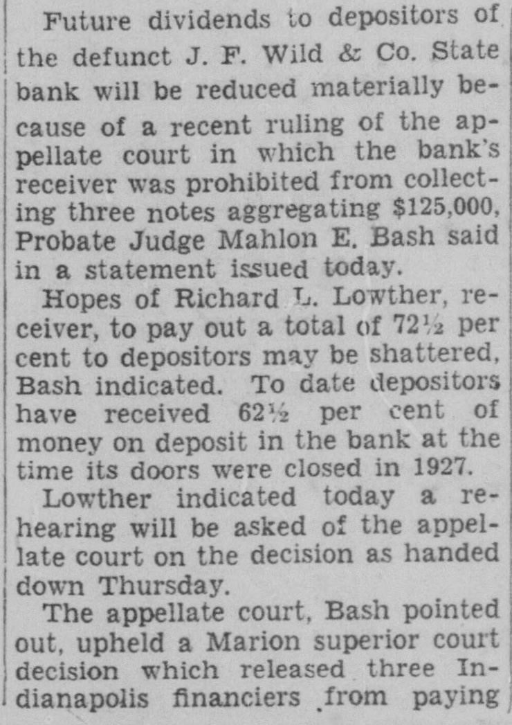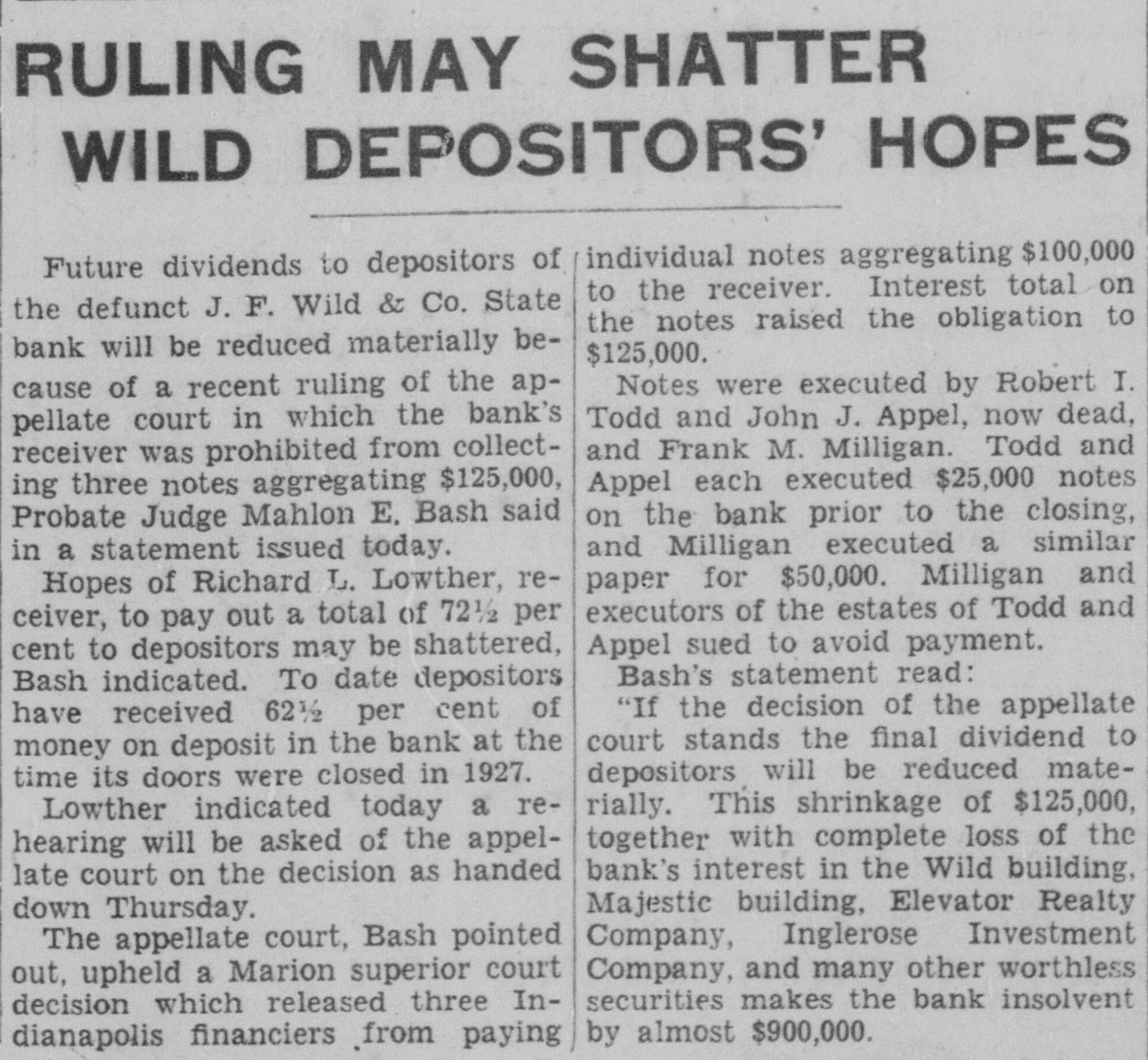RULING MAY SHATTER WILD DEPOSITORS' HOPES Future dividends to depositors of individual notes aggregating $100,000 to the receiver. Interest total on the defunct J. F. Wild & Co. State the notes raised the obligation to bank will be reduced materially be$125,000. Notes were executed by Robert I. cause of a recent ruling of the apTodd and John J. Appel, now dead, pellate court in which the bank's and Frank M. Milligan. Todd and receiver was prohibited from collectAppel each executed $25,000 notes ing three notes aggregating $125,000, on the bank prior to the closing, Probate Judge Mahlon E. Bash said and Milligan executed a similar in a statement issued today. paper for $50,000. Milligan and Hopes of Richard L. Lowther, reexecutors of the estates of Todd and ceiver, to pay out a total of 72½ per Appel sued to avoid payment. cent to depositors may be shattered, Bash's statement read: Bash indicated. To date depositors "If the decision of the appellate have received 62½ per cent of court stands the final dividend to money on deposit in the bank at the depositors will be reduced matetime its doors were closed in 1927. rially. This shrinkage of $125,000, Lowther indicated today a retogether with complete loss of the hearing will be asked of the appelbank's interest in the Wild building, late court on the decision as handed Majestic building, Elevator Realty down Thursday. Company, Inglerose Investment The appellate court, Bash pointed Company, and many other worthless out, upheld a Marion superior court securities makes the bank insolvent decision which released three Inby almost $900,000. dianapolis financiers from paying