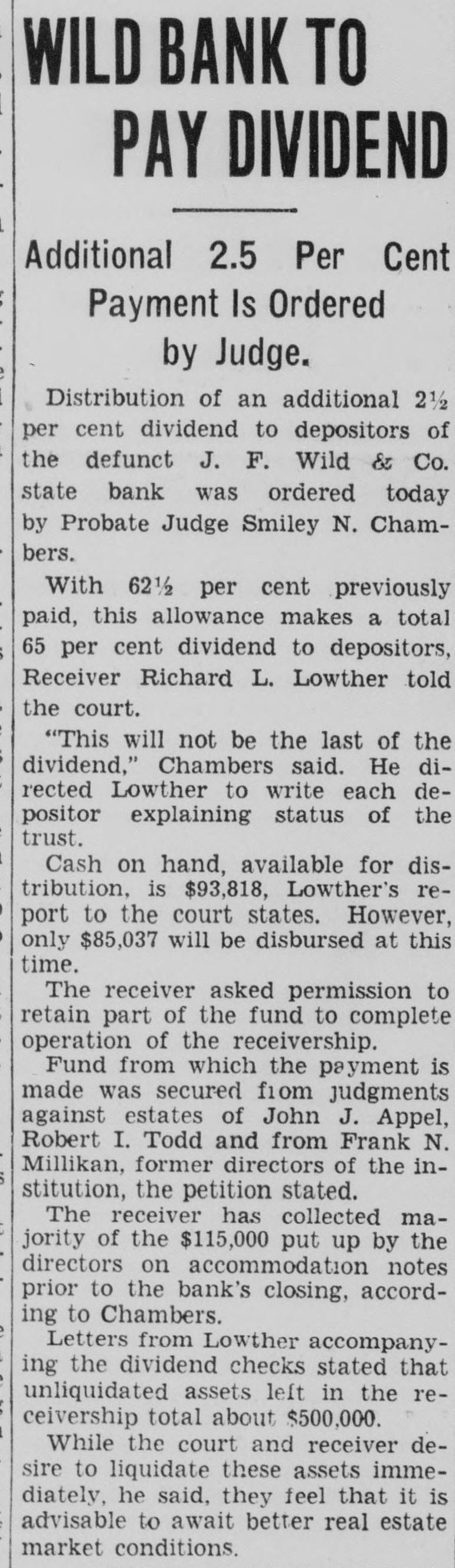 # WILD BANK TO PAY DIVIDEND Additional 2.5 Per Cent Payment Is Ordered by Judge. Distribution of an additional 2½ per cent dividend to depositors of the defunct J. F. Wild & Co. state bank was ordered today by Probate Judge Smiley N. Chambers. With 62½ per cent previously paid, this allowance makes a total 65 per cent dividend to depositors, Receiver Richard L. Lowther told the court. "This will not be the last of the dividend," Chambers said. He directed Lowther to write each depositor explaining status of the trust. Cash on hand, available for distribution, is $93,818, Lowther's report to the court states. However, only $85,037 will be disbursed at this time. The receiver asked permission to retain part of the fund to complete operation of the receivership. Fund from which the payment is made was secured from judgments against estates of John J. Appel, Robert I. Todd and from Frank N. Millikan, former directors of the institution, the petition stated. The receiver has collected majority of the $115,000 put up by the directors on accommodation notes prior to the bank's closing, according to Chambers. Letters from Lowther accompanying the dividend checks stated that unliquidated assets left in the receivership total about $500,000. While the court and receiver desire to liquidate these assets immediately, he said, they feel that it is advisable to await better real estate market conditions.