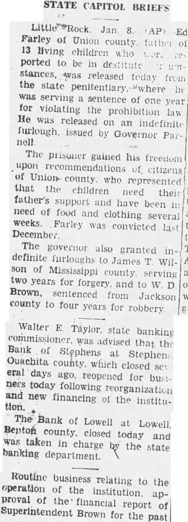 STATE CAPITOL BRIEFS Farley of Union county. father of 13 living children who were ported to be in destitute um stances, was released today from the state penitentiary "where he was serving a sentence of one year for violating the prohibition law He was released on an indefinite furlough, issued by Governor Parnell The prisoner gained his freedom upon recommendations of citizens of Union county. who represented that the children need their father's support and have been in need of food and clothing several weeks. Farley was convicted last December The governor also granted indefinite furloughs to James T. Wilson of Mississippi county. serving two years for forgery. and to W. D Brown, sentenced from Jackson county to four years for robbery Walter E. Taylor. state banking commissioner. was advised that the Bank of Stephens at Stephen Ouachita county. which closed sev eral days ago, reopened for bustness today following reorganization and new financing of the institution. The Bank of Lowell at Lowell, Benton county, closed today and was taken in charge by the state banking department. Routine business relating to the operation of the institution. approval of the financial report of Superintendent Brown for the past