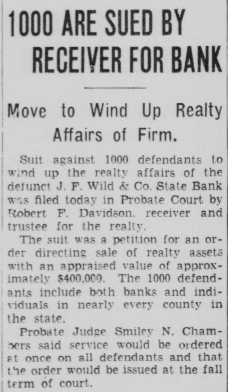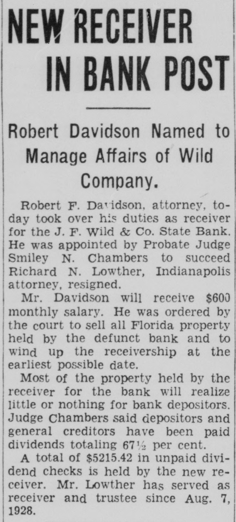 NEW RECEIVER IN BANK POST Robert Davidson Named to Manage Affairs of Wild Company. Robert F. Davidson, attorney, today took over his duties as receiver for the J. F. Wild & Co. State Bank. He was appointed by Probate Judge Smiley N. Chambers to succeed Richard N. Lowther, Indianapolis attorney, resigned. Mr. Davidson will receive $600 monthly salary. He was ordered by the court to sell all Florida property held by the defunct bank and to wind up the receivership at the earliest possible date. Most of the property held by the receiver for the bank will realize little or nothing for bank depositors. Judge Chambers said depositors and general creditors have been paid dividends totaling 67½ per cent. A total of $5215.42 in unpaid dividend checks is held by the new receiver. Mr. Lowther has served as receiver and trustee since Aug. 7, 1928.