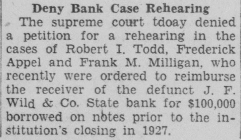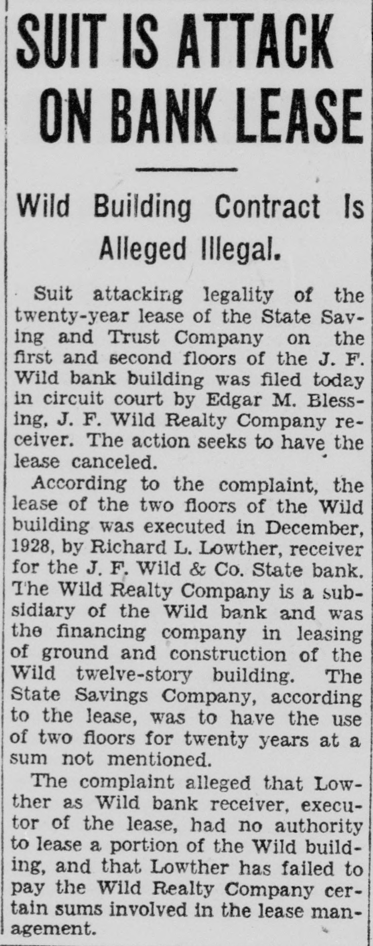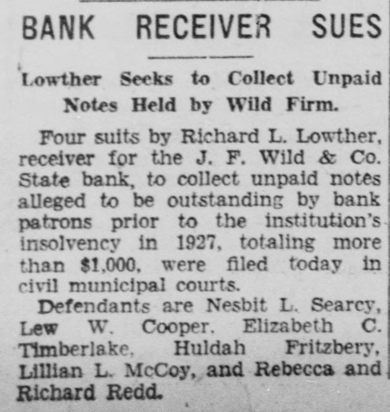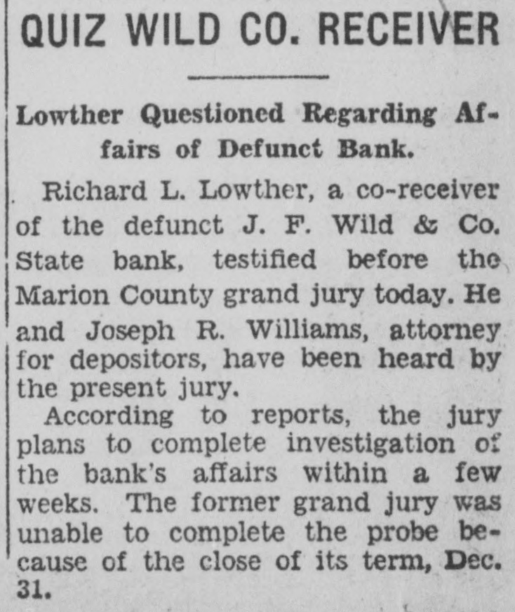 QUIZ WILD CO. RECEIVER Lowther Questioned Regarding Affairs of Defunct Bank. Richard L. Lowther, a co-receiver of the defunct J. F. Wild & Co. State bank, testified before the Marion County grand jury today. He and Joseph R. Williams, attorney for depositors, have been heard by the present jury. According to reports, the jury plans to complete investigation of the bank's affairs within a few weeks. The former grand jury was unable to complete the probe because of the close of its term, Dec. 31.