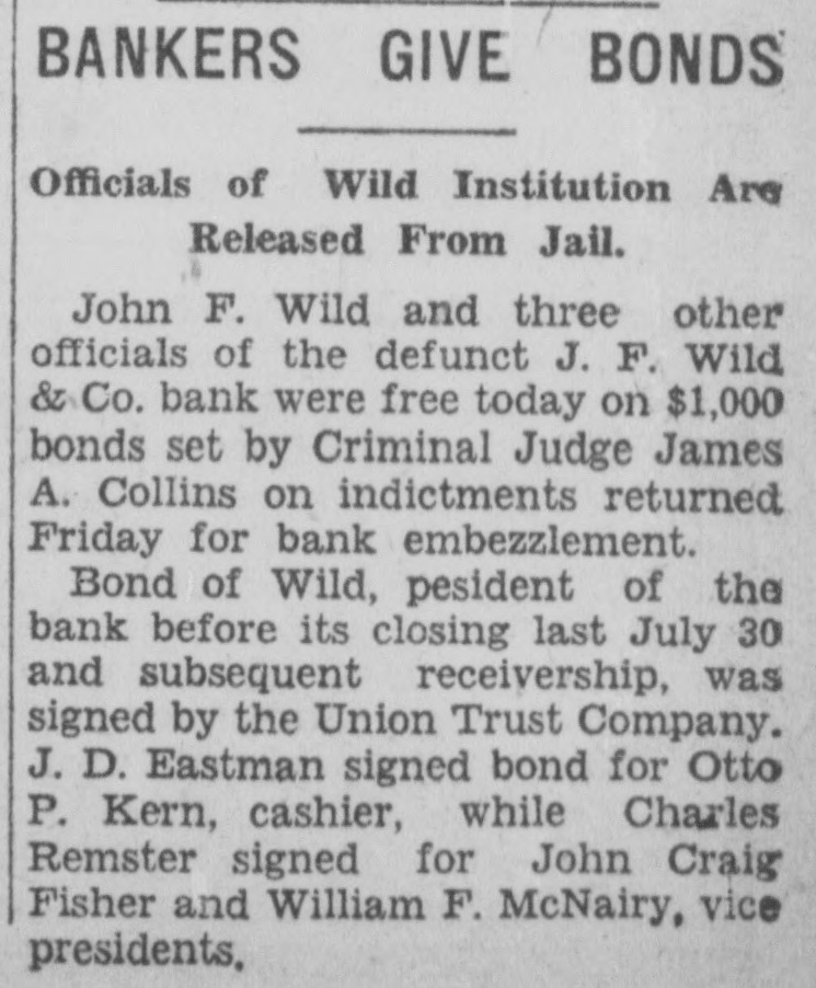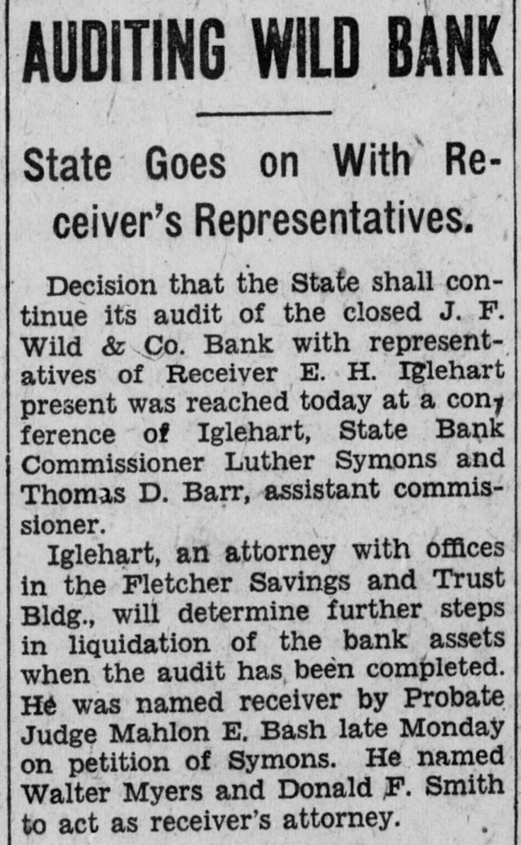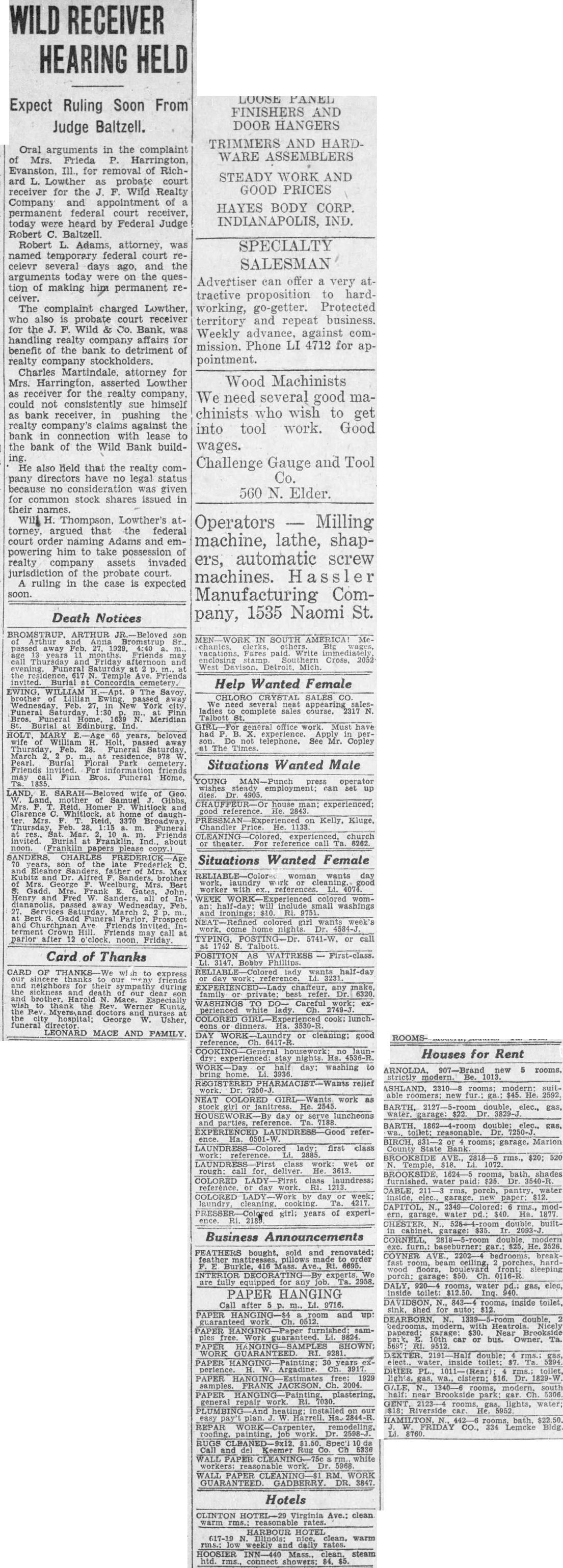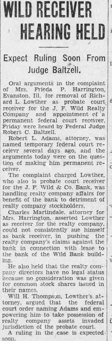 OPEN HEARING IN WILD BANK RECEIVER CASE Mismanagement Complaint Against R. L. Lowther Sifted. Hearing on making permanent appointment of Robert L. Adams as receiver for the J. F. Wild Realty Company was started today before Federal Judge Robert C. Baltzell. Adams was made temporary receiver several days ago on complaint of Mrs. Frieda P. Harrington, Evanston, Ill., a preferred stockholder, that Richard L. Lowther, serving as receiver, under Marion probate court, for both the realty company and the J. F. Wild & Co. Bank, of which the realty company was a subsidiary, was handling the realty company affairs for benefit of the bank instead of for the realty company. Offer of W. H. Thompson, Lowther's attorney, to have Charles Martindale, attorney for Mrs. Harrington, named attorney for Lowther as receiver, or for the present three directors to resign in favor of three disinterested directors, was rejected by Martindale. Two witnesses were called this morning before court recessed until 2 p. m., Dwight Posten, Attica, Ind., and James M. Waugh, Crawfordsville, both stockholders. Waugh testified Lowther told him the realty company was indebted to the bank in the sum of $181,000, representing an advance made by the bank, and suggested that preferred stockholders permit all stock to be made common stock SO they might all have a voice in operation of the company. It was testified Lowther, as bank receiver, holds all present common stock in the realty company. The realty company was formed by the bank to finance construction and operation of the bank building, the bank contracting to pay all interest and other costs, and to retire the realty company's preferred stock.
