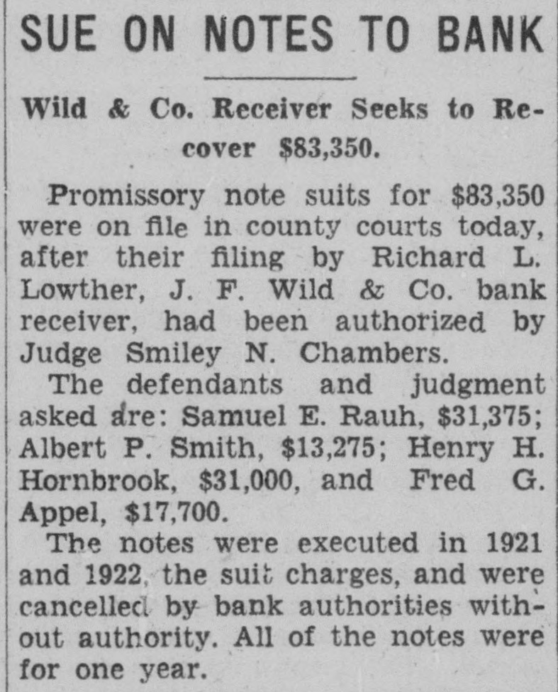 # SUE ON NOTES TO BANK Wild & Co. Receiver Seeks to Recover $83,350. Promissory note suits for $83,350 were on file in county courts today, after their filing by Richard L. Lowther, J. F. Wild & Co. bank receiver, had been authorized by Judge Smiley N. Chambers. The defendants and judgment asked are: Samuel E. Rauh, $31,375; Albert P. Smith, $13,275; Henry H. Hornbrook, $31,000, and Fred G. Appel, $17,700. The notes were executed in 1921 and 1922, the suit charges, and were cancelled by bank authorities without authority. All of the notes were for one year.