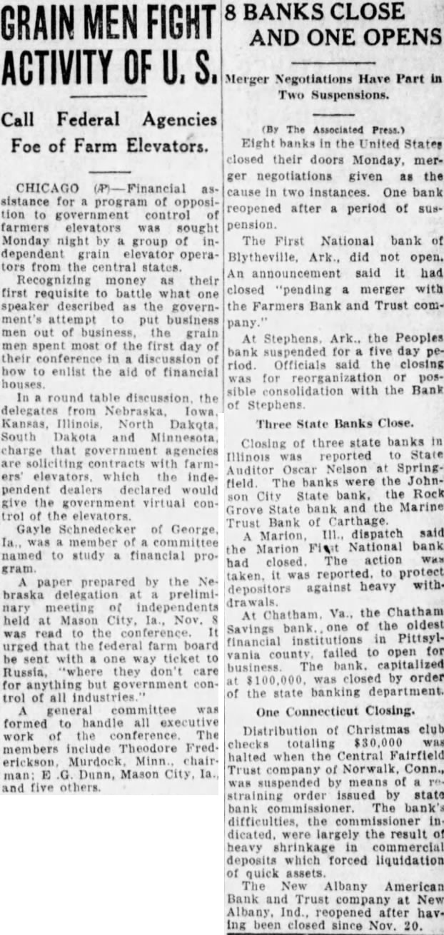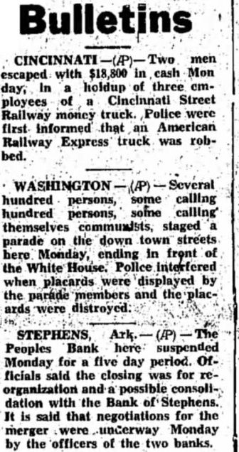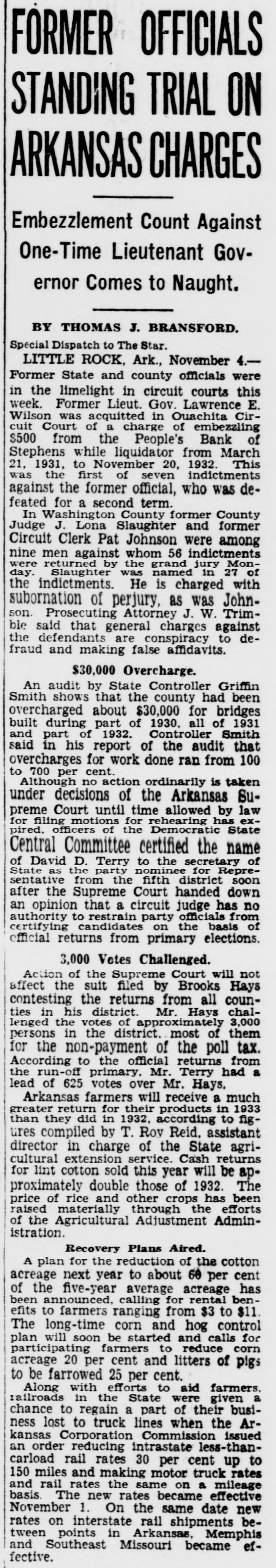 FORMER OFFICIALS STANDING TRIAL ON ARKANSAS CHARGES Embezzlement Count Against One-Time Lieutenant Governor Comes to Naught. BY THOMAS J. BRANSFORD. Special Dispatch to The Star. LITTLE ROCK, Ark., November 4.Former State and county officials were in the limelight in circuit courts this week. Former Lieut. Gov. Lawrence E. Wilson was acquitted in Ouachita Circuit Court of a charge of embezzling $500 from the People's Bank of Stephens while liquidator from March 21, 1931, to November 20, 1932. This was the first of seven indictments against the former official, who was defeated for a second term. In Washington County former County Judge J. Lona Slaughter and former Circuit Clerk Pat Johnson were among nine men against whom 56 indictments were returned by the grand jury Monday. Slaughter was named in 27 of the indictments. He is charged with subornation of perjury, as was Johnson. Prosecuting Attorney J. W. Trimble said that general charges against the defendants are conspiracy to defraud and making false affidavits. $30,000 Overcharge. An audit by State Controller Griffin Smith shows that the county had been overcharged about $30,000 for bridges built during part of 1930. all of 1931 and part of 1932. Controller Smith said in his report of the audit that overcharges for work done ran from 100 to 700 per cent. Although no action ordinarily is taken under decisions of the Arkansas Supreme Court until time allowed by law for filing motions for rehearing has expired, officers of the Democratic State Central Committee certified the name of David D. Terry to the secretary of State as the party nominee for Representative from the fifth district soon after the Supreme Court handed down an opinion that a circuit judge has no authority to restrain party officials from certifying candidates on the basis of official returns from primary elections. 3,000 Votes Challenged. Action of the Supreme Court will not affect the suit filed by Brooks Hays contesting the returns from all counties in his district. Mr. Hays challenged the votes of approximately 3,000 persons in the district. most of them for the non-payment of the poll tax. According to the official returns from the run-off primary, Mr. Terry had a lead of 625 votes over Mr. Hays. Arkansas farmers will receive a much greater return for their products in 1933 than they did in 1932, according to figures compiled by T. Roy Reid. assistant director in charge of the State agricultural extension service. Cash returns for lint cotton sold this year will be approximately double those of 1932. The price of rice and other crops has been raised materially through the efforts of the Agricultural Adjustment Administration. Recovery Plans Aired. A plan for the reduction of the cotton acreage next year to about 60 per cent of the five-year average acreage has been announced, calling for rental benefits to farmers ranging from $3 to $11. The long-time corn and hog control plan will soon be started and calls for participating farmers to reduce corn acreage 20 per cent and litters of pigs to be farrowed 25 per cent. Along with efforts to aid farmers. railroads in the State were given a chance to regain a part of their business lost to truck lines when the Arkansas Corporation Commission issued an order reducing intrastate less-thancarload rail rates 30 per cent up to 150 miles and making motor truck rates and rail rates the same on a mileage basis. The new rates became effective November 1. On the same date new rates on interstate rail shipments between points in Arkansas, Memphis and Southeast Missouri became effective.