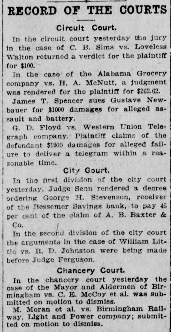 RECORD OF THE COURTS Circuit Court. In the circuit court yesterday the jury in the case of C. B. Sims vs. Loveless Walton returned a verdict for the plaintiff for $100. In the case of the Alabama Grocery company vs. H. A. McNutt, a judgment was rendered for the plaintiff for $262.62. James T. Spencer sues Gustave Newbauer for $1000 damages for alleged assault and battery. G. D. Floyd vs. Western Union Telegraph company. Plaintiff claims of the defendant $1900 damages for alleged failure to deliver a telegram within a reasonable time. City Gourt. In the first division of the city court yesterday, Judge Senn rendered a decree ordering George H. Stevenson, receiver of the Bessemer Savings bank, to pay 45 per cent of the claim of A. B. Baxter & Co. In the second division of the city court the arguments in the case of William Little vs. R. D. Johnston were being made before Judge Ferguson. Chancery Court. In the chancery court yesterday the case of the Mayor and Aldermen of Birmingham vs. C. E. McCoy et al. was submitted on motion to dismiss. M. Moran et al. vs. Birmingham Railway, Light and Power company; submitted on motion to dismiss.