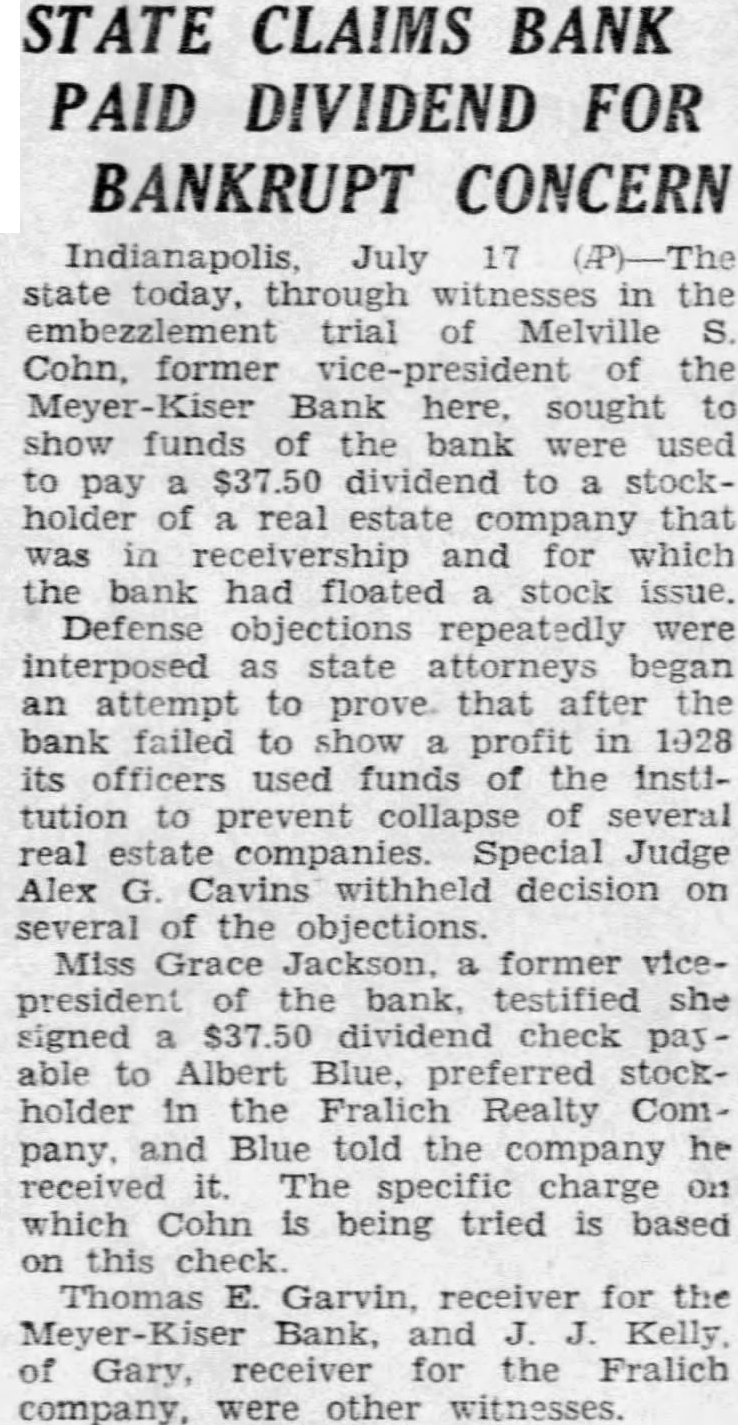 STATE CLAIMS BANK PAID DIVIDEND FOR BANKRUPT CONCERN Indianapolis, July 17 (A)-The state today, through witnesses in the embezzlement trial of Melville S. Cohn, former vice-president of the Meyer-Kiser Bank here, sought to show funds of the bank were used pay a $37.50 dividend to a stockholder of a real estate company that was in receivership and for which the bank had floated stock issue. Defense objections repeatedly were interposed as state attorneys began an attempt to prove. that after the bank failed to show profit in 1028 its officers used funds of the institution to prevent collapse of several real estate companies. Special Judge Alex G. Cavins withheld decision on several of the objections. Miss Grace Jackson, a former vicepresident of the bank, testified she signed $37.50 dividend check payable to Albert Blue, preferred stockholder in the Fralich Realty Company, and Blue told the company he received it. The specific charge On which Cohn is being tried is based on this check. Thomas E. Garvin, receiver for the Meyer-Kiser Bank, and J. J. Kelly. of Gary, receiver for the Fralich company, were other witnesses.