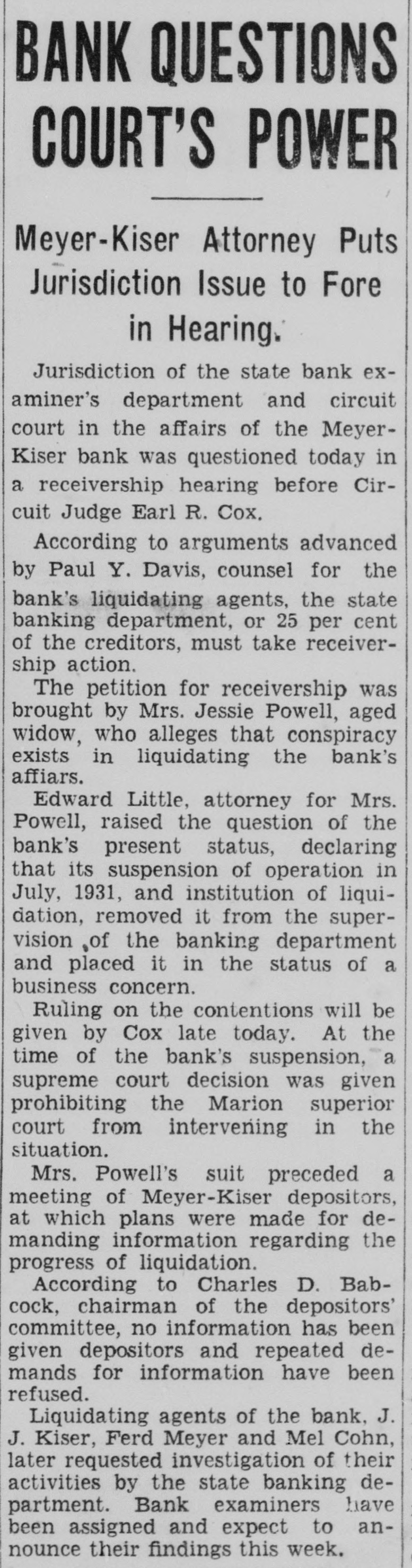 Mr. Mattice, in his opening statebank. ment, asserted that the state would introduce evidence to convince the that the defendant "wrongfully jury handled and fraudulently appropriated money of the bank the use another person. The indictment is based on bank the alleged appropriation of money investor belonging to the bank to the Fralich Realty Company .50 dividend check to stockholder in the realty company. of in most Three other officers the bank fiscal inand S. Meyer, vice president, and the Julian Kiser, also vice president, were indicted by the grand jury on charges of and grand Bank larceny in connection with the leged illegal transaction. The defendmen, ants asked separate trials and the state elected to try Cohn first. already The defense attorney, in his statement to the jury, characterized the bad alleged appropriation He by the bank officers bank funds to the credit of the which had money on deposit in the bank. paid.