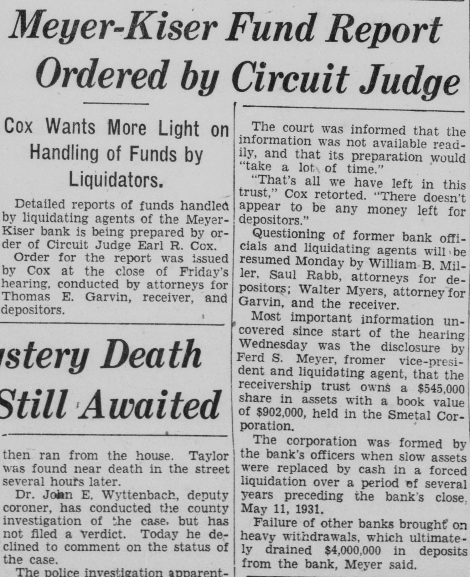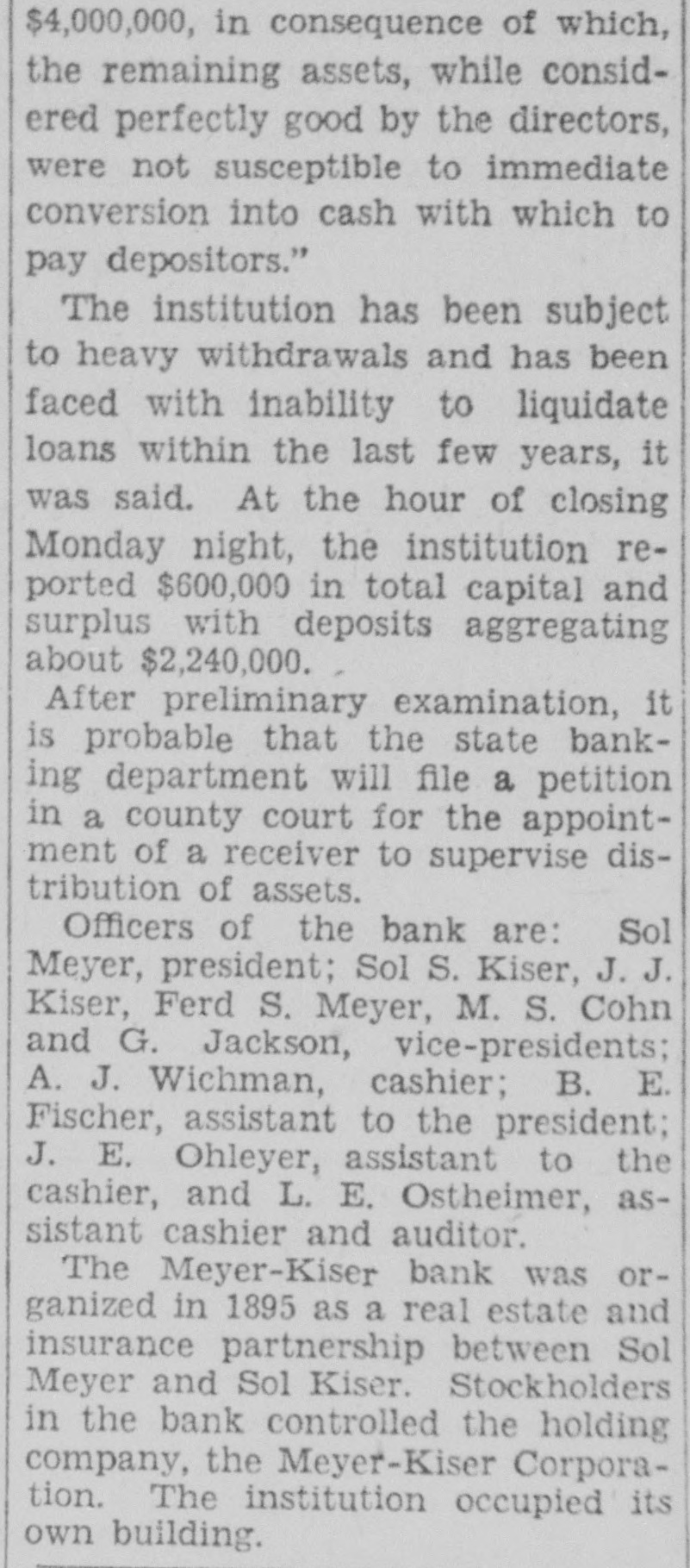 When the institution began to totter under pressure of cash drainage from withdrawals, slow assets of the bank were purchased with cash produced from the private fortunes of the stockholders, Meyer testified.