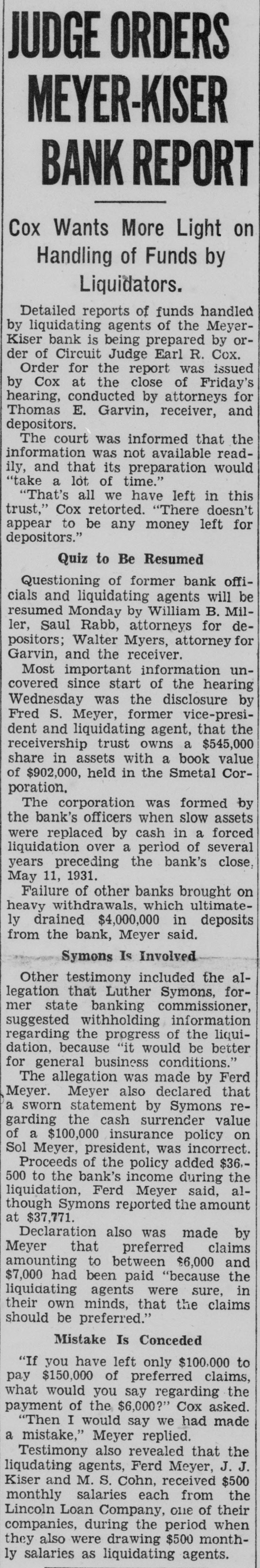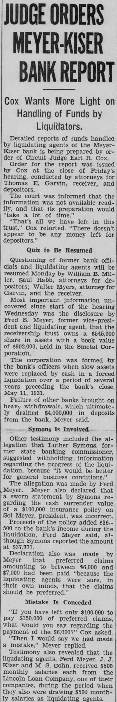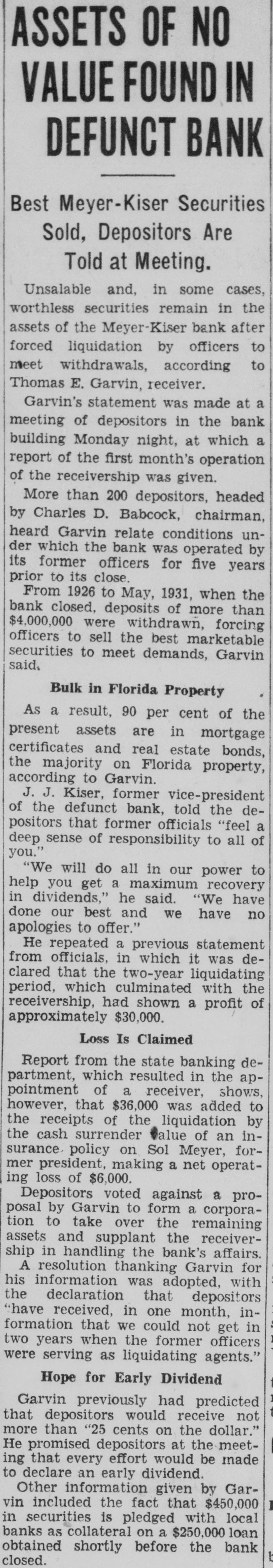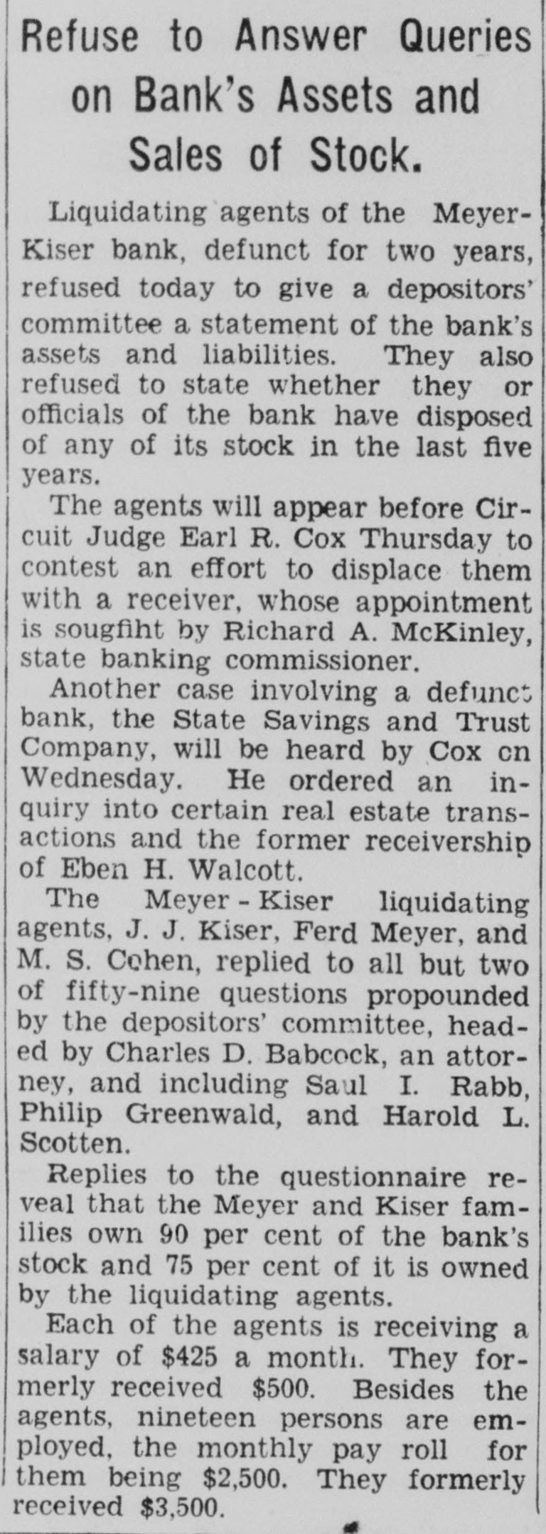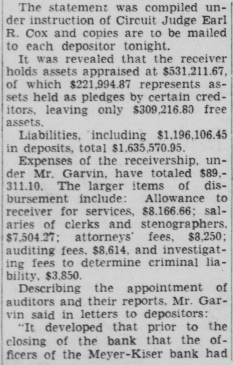 "Then you think the Meyer-Kiser bank still is solvent?" Miller asked.