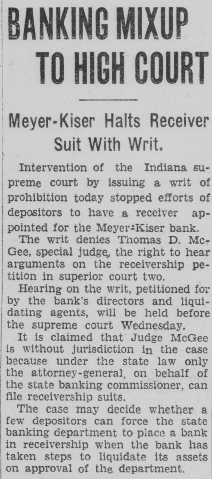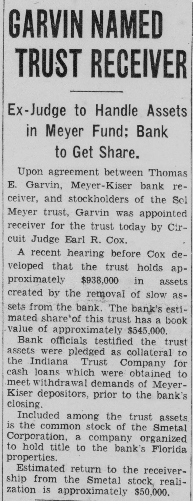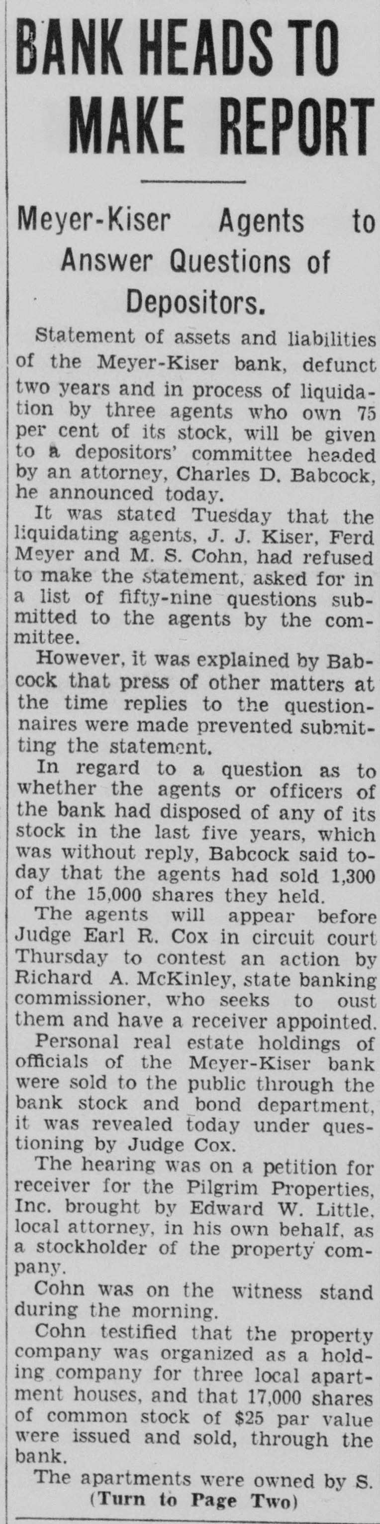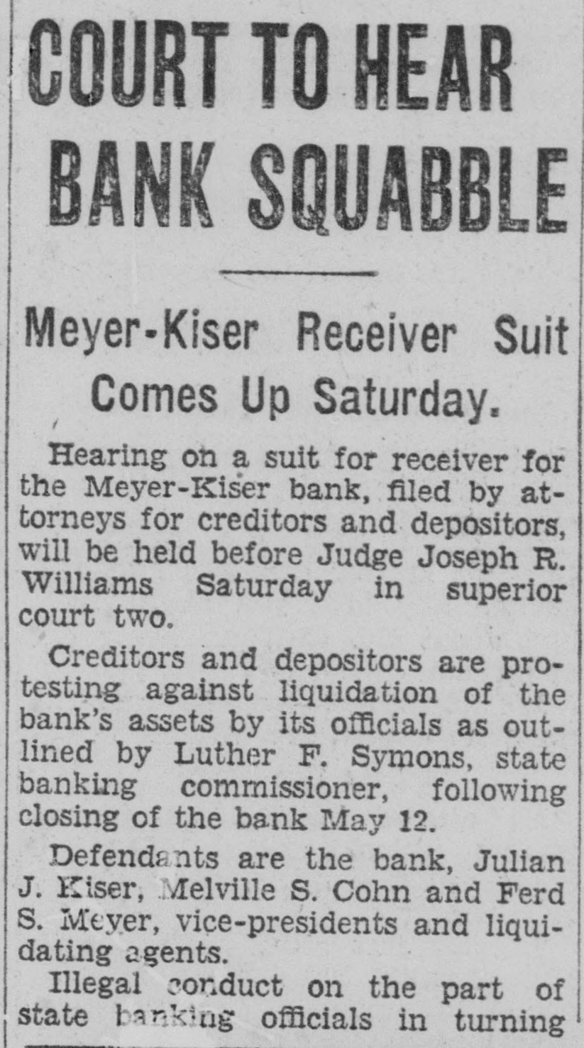 "Then you think the Meyer-Kiser bank still is solvent?" Miller asked.