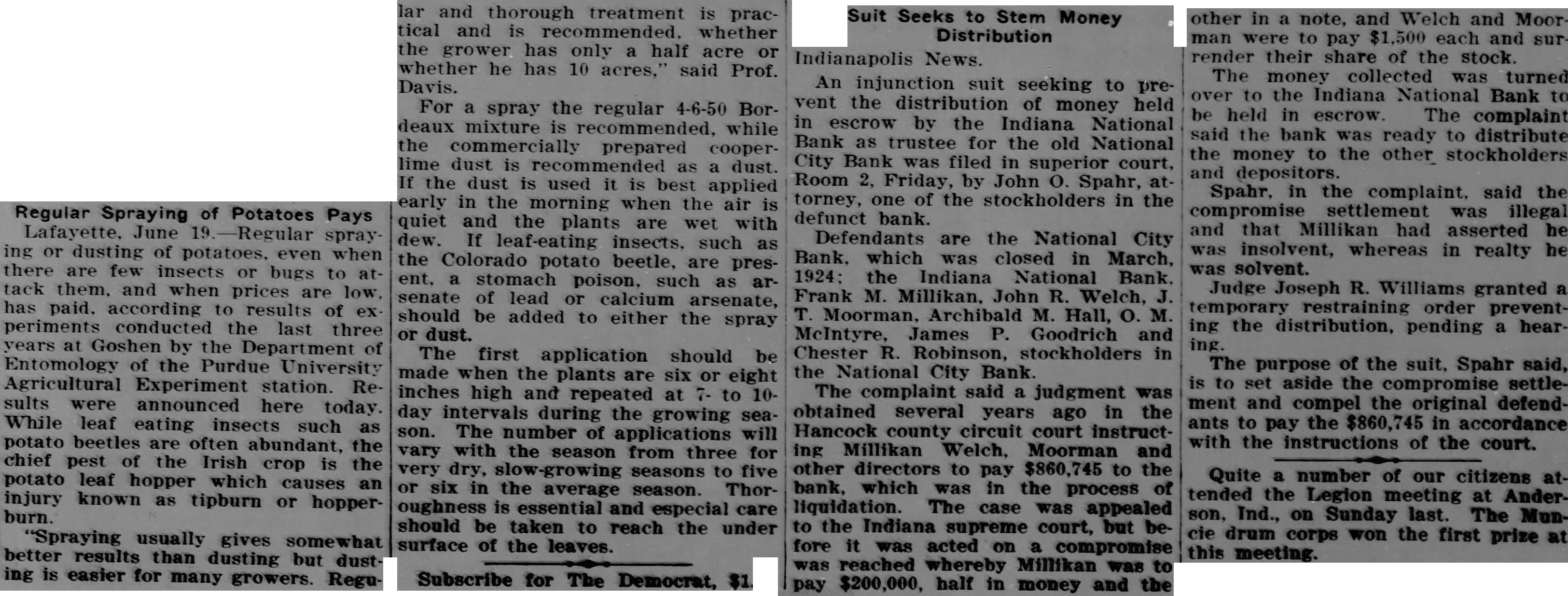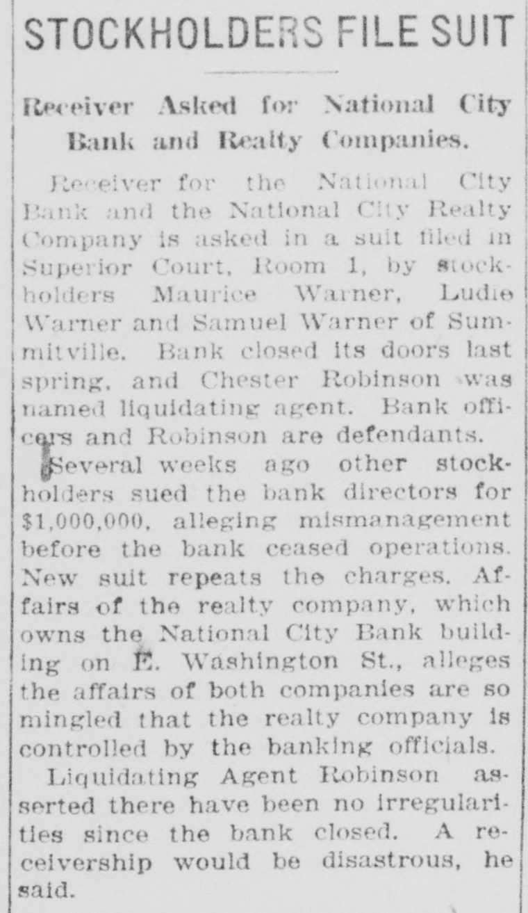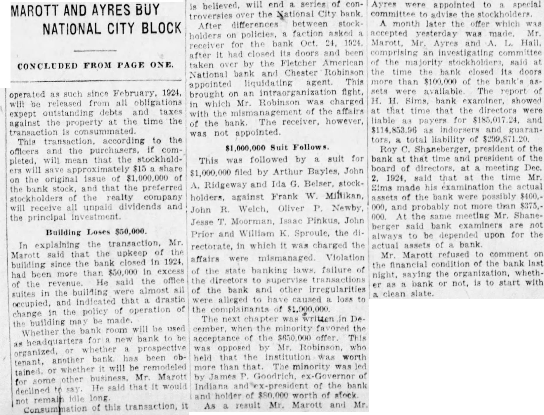 Indianapolis News. An injunction suit seeking to prevent the distribution of money held in escrow by the Indiana National Bank as trustee for the National City Bank was filed in superior court, Room 2. Friday, by John O. Spahr, at torney, one of the stockholders in the defunct bank. Defendants are the National City Bank. which was closed in March, 1924: the Indiana National Bank. Frank M. Millikan, John R. Welch. J. T. Moorman. Archibald M. Hall, O. M. McIntyre, James P. Goodrich and Chester R. Robinson, stockholders in the National City Bank The complaint said a judgment was obtained several years ago in the Hancock county circuit court instruct ing Millikan Welch. Moorman and other directors to pay $860.745 to the bank. which was in the process of liquidation. The case was appealed to the Indiana supreme court, but before it was acted on a compromise was reached whereby Millikan was to pay $200,000, half in money and the other in a note. and Welch and Moor man were to pay each and sur render their share of the stock The money collected turned over to the Indiana National Bank to be held in escrow The complaint said the bank was ready to distribute the money to the other stockholders and depositors. Spahr. in the complaint, said the compromise settlement was illegal and that Millikan had asserted he was insolvent, whereas in realty he was solvent. Judge Joseph R. Williams granted a temporary restraining order preventing the distribution, pending a hearing The purpose of the suit, Spahr said, is to set aside the compromise settlement and compel the original defendants to pay the $860.745 in accordance with the instructions of the court.