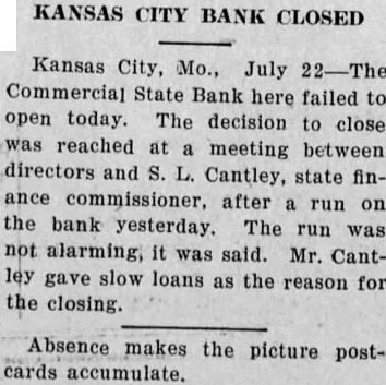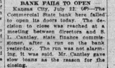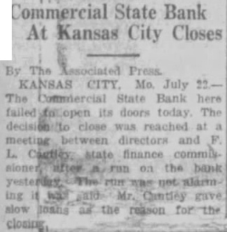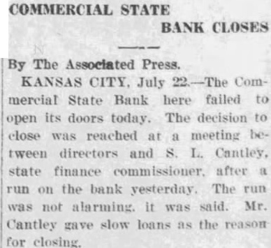 Kansas City, Mo., July 22-The Commercial State Bank here failed to open today. The decision to close was reached at a meeting between directors and S. L. Cantley, state finance commissioner, after a run on the bank yesterday. The run was not alarming, it was said. Mr. Cantley gave slow loans as the reason for the closing.