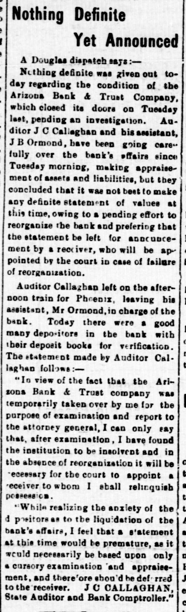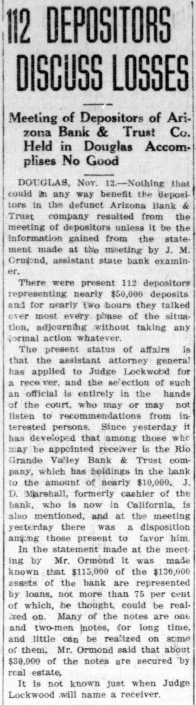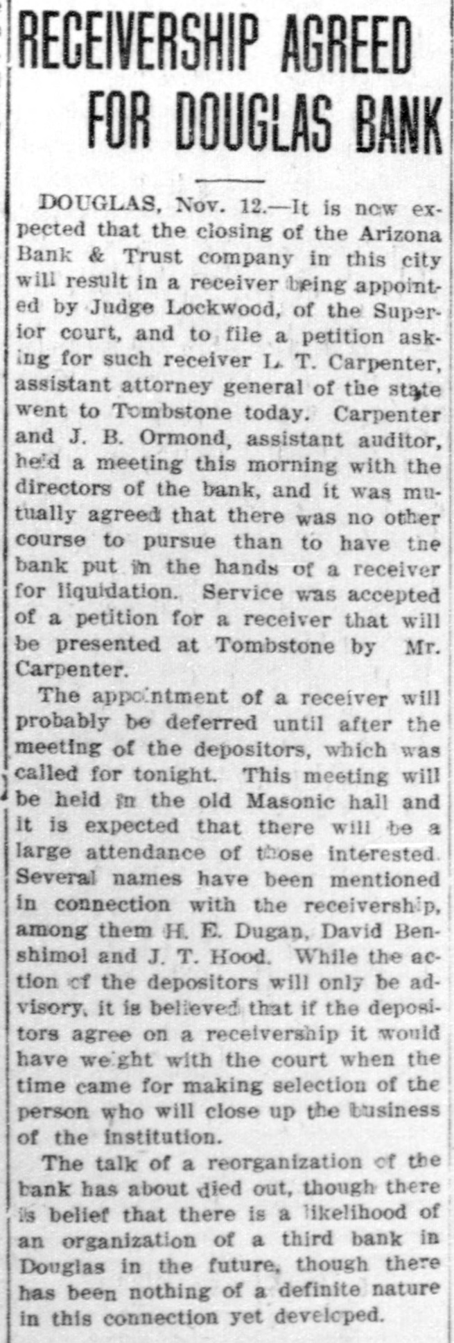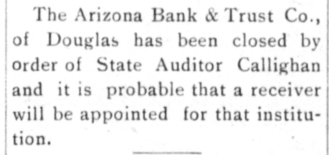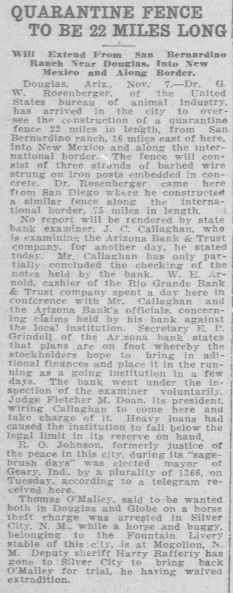 QUARANTINE FENCE TO BE 22 MILES LONG Will Extend From San Bernardino Ranch Near Douglas, Into New Mexico and Along Border. Douglas, Ariz., Nov. 7.-Dr. G. W. Rosenberger, of the United States bureau of animal industry, has arrived in the city to oversee the construction of a quarantine fence 22 miles in length, from San Bernardino ranch, 16 miles east of here, into New Mexico and along the international border. The fence will consist of three strands of barbed wire strung on iron posts embedded in concrete. Dr. Rosenberger came here from San Diego where he constructed a similar fence along the international border, 75 miles in length, No report will be rendered by state bank examiner, J. C: Callaghan, who is examining the Arizona Bank & Trust company, for another day, he stated today. Mr. Callaghan has only partially concluded the checking of the notes held by the bank. W. E. Arnold, cashier of the Rio Grande Bank & Trust company spent a day here in conference with Mr. Callaghan and the Arizona Bank's officials, concerning claims held by his bank against the local institution. Secretary E. P. Grindell of the Arizona bank states that plans are on foot whereby the stockholders hope to bring in aditional finances and place it in the running as a going institution in a few days. The bank went under the inspection of the examiner voluntarily, Judge Fletcher M. Doan, its president, wiring Callaghan to come here and take charge of it. Heavy loans had caused the institution to fall below the legal limit in its reserve on hand. R. 0. Johnson, formerly justice of the peace in this city, during its "sagebrush days" was elected mayor of Geary, Ind., by a plurality of 1366, on Tuesday, according to a telegram received here. Thomas O'Malley, said to be wanted both in Douglas and Globe on a horse theft charge was arrested in Silver City, N. M., while a horse and buggy, belonging to the Fountain Livery stable of this city, is at Mogollon, N. M. Deputy sheriff Harry Rafferty has gone to Silver City to bring back O'Malley for trial, he having waived extradition.