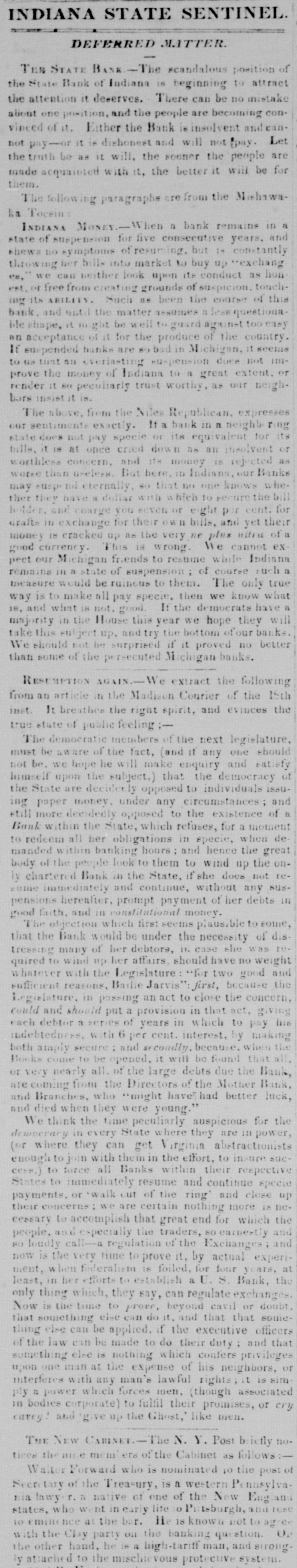 # DEFERRED MATTER. TER STATE BANK - The scandalous position of the State Bank of Indiana is beginning to attract the attention it deserves. There can be no mistake about one position, and the people are becoming convinced of it. Either the Bank is insolvent and cannot pay—or it is dishonest and will not pay. Let the truth be as it will, the sooner the people are made acquainted with it, the better it will be for them. The following paragraphs are from the Mishawaka Tocsin: INDIANA MONEY. When a bank remains in a state of suspension for five consecutive years, and shews no symptoms of resuming, bot is constantly throwing her bills into market to buy up "exchang-es," we can neither look upon its conduct as honest, or free from creating grounds of suspicion, touching its ABILITY. Such as been the course of this bank, and until the matter assumes a less questionable shape, it might be well to guard against too easy an acceptance of it for the produce of the country. If suspended banks are so bad in Michigan, it seems to us tint an everlasting suspension duce not improve the money of Indiana to a great extent, or render it so peculiarly trust worthy, as our neighbors insist it is. The above, from the Niles Republican, expresses cur sentiments exactly. It a bank in a neighborong state does not pay specie or its equivalent for its bills, it is at once cried down as an insolvent or worthless concern, and its money is rejected as worse than useless. But here, in Indiana, our Banks may suspend eternally, so that no one knows whe-ther they have a doliar with which to secure the bill holder, and charge you seven or eight por cent. for drafts in exchange for their own bills, and yet their money is cracked up as the very ne plus ultra of a good currency. This is wrong. We cannot ex-pect our Michigan friends to resume winde Indiana remains in a state of suspension; of course such a measure would be ruincus to them. The only true way is to make all pay specie, then we know what is, and what is not, good. If the democrats have a majority in the House this year we hope they will take this subject up, and try the bottom of our banks. We should not be surprised if it proved no better than some of the persecuted Michigan banks. RESUMPTION AGAIN. We extract the following from an article in the Madison Courier of the 15th inst. It breathes the right spirit, and evinces the true state of public feeling;- The democratic members of the next legislature, must be aware of the fact, (and if any one should not be, we hope he will make enquiry and satisfy himself upon the subject,) that the democracy of the State are decidetly opposed to individuals issuing paper money, under any circumstances; and still more decidedly opposed to the existence of a Bank within the State, which refuses, for a moment to redeem all her obligations in specie, when de-manded within banking hours; and hence the great body of the people look to them to wind up the on-ly chartered Bank in the State, if she does not re-sume immediately and continue, without any sus-pensions hereafter, prompt payment of her debts in good faith, and in constitutional money. The objection which first seems plausible to some, that the Bank would be under the necessity of dis-tressing many of her debtors, in case she was re-quired to wind up her affairs, should have no weight whatever with the Legislature: "for two good and sufficient reasons, Bailie Jarvis": first, because the Legislature, in passing an act to close the concern, could and should put a provision in that act, giving each debtor a series of years in which to pay his indebtedness, with 6 per cent. interest, by making both araply secure; and secondly, because, when the Bocks come to be opened, it will be found that all, or very nearly all, of the large debts due the Bank, are coming from the Directors of the Mother Bank, and Branches, who "might have had better luck, and died when they were young." We think the time peculiarly auspicious for the democracy in every State where they are in power, (or where they can get Virginia abstractionists enough to join with them in the effort, to insure success,) to force all Banks within their respective States to immediately resume and continue specie payments, or 'walk out of the ring and close up their concerns; we are certain nothing more is ne-cessary to accomplish that great end for which the people, and especially the traders, so earnestly and so loudly call—a regulation of the Exchanges; and now is the very time to prove it, by actual experi-ment, when federalism is foiled, for four years, at least, in her efforts to establish a U. S. Bank, the only thing which, they say, can regulate exchanges. Now is the time to prove, beyond cavil or doubt. that something else can do it, and that that some-thing else can be applied, if the executive officers of the law can be made to do their duty; and that something else is nothing which confers privileges upon one man at the expense of his neighbors, or interferes with any man's lawful rights; it is sim-ply a power which forces men, (though associated in bodies corporate) to fulfil their promises, or cry carey! and 'give up the Ghost,' like men. # THE NEW CABINET. The N. Y. Post briefly notices the aune mem'ers of the Cabinet as follows:- Walter Forward who is nominated to the post of Secretary of the Treasury, is a western Pennsylvania lawyer, a native of one of the New England states, who went in early life to Putsburgh, and rose to eminence at the bar. He is known not to agree with the Clay party on the banking question. De the other hand, he is a high-tariff man, and strong-ly attached to the mischievous protective system.