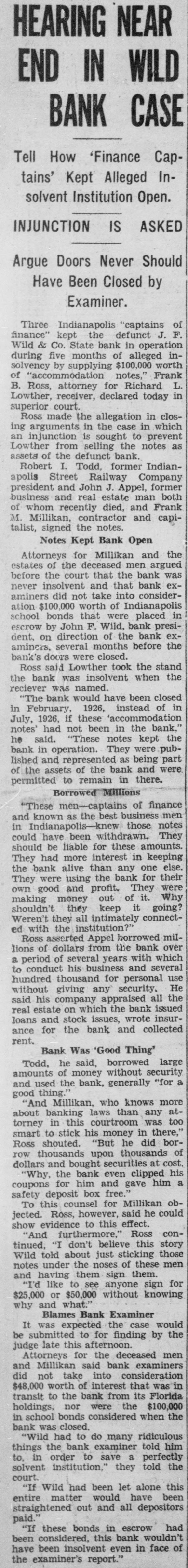 HEARING NEAR IN END WILD CASE BANK How Cap'Finance InTell tains' Kept Alleged solvent Institution Open. INJUNCTION IS ASKED Argue Doors Never Should by Have Been Closed Examiner. of Three Indianapolis the defunct "captains J. F. operation finance' Wild & Co. kept State bank of in alleged inmonths $100,000 worth during five by supplying notes," Frank L. of solvency "accommodation for Richard Lowther, B. Ross, receiver, attorney declared today in closcourt. allegation in made in an superior Ross arguments the in the case to prevent which selling ing injunction is sought the notes as Lowther of the from defunct former bank. Indianassets I. Todd, Company real president apolis Robert Street and John Railway estate J. Appel, man former Frank both M. talist, signed the of business whom Millikan, and recently contractor notes. died, and and capithe Notes Kept Bank Open and estates Attorneys for deceased Millikan men argued was before insolvent the of the court and that that into the bank consider- bank exnever not take Indianapolis in were placed school F. ation aminers $100,000 bonds did worth that Wild, of bank presi- exby John of the bank the escrow on direction months before aminers, were dent, several closed. stand bank's doors Lowther took when the the the Ross bank said was named. insolvent closed reciever was would have been of in in "The February. bank these 1926, accommodation instead of bank, July, 1926, if been in the had notes notes' he said. "These not They being were kept pub- part the lished bank in and operation. represented the bank as and were of the assets of remain in there. permitted Borrowed to Millions finance of men "These known as the best those notes in and Indianapolis- been knew withdrawn. these amounts. They could have for keeping their should They had be alive liable more than interest bank any in one for else. the bank the were and of it. were using profit. They Why making They own good money out keep it going? they connectshouldn't intimately Weren't the ed with they institution? all Appel borrowed milasserted the bank over period of business and use lions a Ross of dollars several his from years for personal with several which He hundred to conduct thousand any security. without company giving appraised bank all issued the said estate his on which issues, the wrote insurance real loans and for stock the bank and collected rent. Was Good Thing' Bank said, borrowed security large Todd, he without "for a amounts and used of the money bank, generally knows more about good thing." Millikan, who than any attorney "And banking in this laws courtroom money in was there, too smart ROSS thousands shouted. to stick his upon "But securities thousands he did at cost. bor- of row and bought even clipped his the and gave dollars "Why, for him bank free. him ob- a coupons deposit box Millikan safety To this ROSS, counsel however, to this for effect. said he could conjected. evidence Ross show tinued, 'And "I furthermore." about don't just believe sticking of these this those story men Wild told the noses them. notes under sign and having them see anyone sign for "I'd like or $50,000 to without why and what.' Bank Examiner $25,000 Blames case knowing would It was expected to for the finding by the be submitted this afternoon. men judge late for the deceased and did Attorneys Millikan not take said interest into bank consideration that was in examiners to transit the were $48,000 worth the of bank from its $100,000 Florida holdings, in school bonds nor considered ridiculous when the bank "Wild was had closed. to do examiner many told him bank perfectly things the to save a told the solvent to. in order institution," they this court. "If Wild had been would let have alone been straightened entire matter out and all depositors had paid. "If these bonds this in bank escrow wouldn't of have been examiner's been considered, insolvent report.' even in face