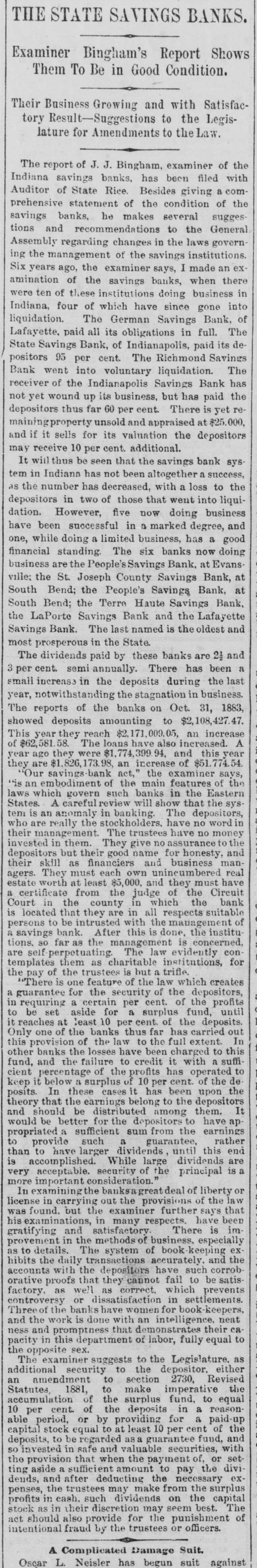THE STATE SAVINGS BANKS. Examiner Bingham's Report Shows Them To Be in Good Condition. Their Business Growing and with Satisfactory Result-Suggestions to the Legislature for Amendments to the Law. The report of J. J. Bingham, examiner of the Indiana savings banks, has been filed with Auditor of State Rice. Besides giving a comprehensive statement of the condition of the savings banks, he makes several suggestions and recommendations to the General Assembly regarding changes in the laws govern ing the management of the savings institutions. Six years ago, the examiner says, I made an examination of the savings banks, when there were ten of these institutions doing business in Indiana, four of which have since gone into liquidation. The German Savings Bank, of Lafayette, paid all its obligations in full. The State Savings Bank, of Indianapolis, paid its depositors 95 per cent. The Richmond Savings Bank went into voluntary liquidation. The receiver of the Indianapolis Savings Bank has not yet wound up its business, but has paid the depositors thus far 60 per cent. There is yet remainingproperty unsold and appraised at $25.000, and if it sells for its valuation the depositors may receive 10 per cent. additional. It will thus be seen that the savings bank system in Indiana has not been altogether a success, as the number has decreased, with a loss to the depositors in two of those that went into liquidation. However, five now doing business have been successful in a marked degree, and one, while doing a limited business, has a good financial standing. The six banks now doing business are the People's Savings Bank, at Evansville; the St. Joseph County Savings Bank, at South Bend; the People's Savings Bank, at South Bend; the Terre Haute Savings Bank, the LaPorte Savings Bank and the Lafayette Savings Bank. The last named is the oldest and most prosperous in the State. The dividends paid by these banks are 21 and 3 per cent. semi annually. There has been a small increase in the deposits during the last year, notwithstanding the stagnation in business. The reports of the banks on Oct. 31, 1883, showed deposits amounting to $2,108,427.47. This year they reach $2,171,009.05, an increase of $62,581.58. The loans have also increased. A year ago they were $1,774,399 94, and this year they are $1,826,173.98, an increase of $51.774.54 "Our savings act," the examiner says, "tis an embodiment of the main features of the laws which govern such banks in the Eastern States. A careful review will show that the system is an anomaly in banking. The depositors, who are really the stockholders. have no word in their management. The trustees have no money invested in them. They give no assurance to the depositors but their good name for honesty, and their skill as financiers and business managers. They must each own unincumbered real estate worth at least $5,000, and they must have a certificate from the judge of the Circuit Court in the county in which the bank is located that they are in all respects suitable persons to be intrusted with the management of a savings bank. After this is done, the institutions. so far as the management is concerned, are self perpetuating. The law evidently contemplates them as charitable institutions, for the pay of the trustees is but a trifle. "There is one feature of the law which creates a guarantee for the security of the depositors, in requiring a certain per cent. of the profits to be set aside for a surplus fund, until it reaches at least 10 per cent. of the deposits. Only one of the banks thus far has carried out this provision of the law to the full extent. In other banks the losses have been charged to this fund, and the failure to credit it with a sufficient percentage of the profits has operated to keep it below a surplus of 10 per cent. of the de posits. In these cases it has been upon the theory that the earnings belong to the depositors and should be distributed among them. It would be better for the depositors to have appropriated a sufficient sum from the earnings to provide such a guarantee, rather than to have larger dividends, until this end is accomplished. While large dividends are very acceptable. security of the principal is a more important consideration." In examining the banksagreatdeal of liberty or license in carrying out the provisions of the law was found. but the examiner further says that his examinations, in many respects. have been gratifying and satisfactory. There is improvement in the methods of business. especially as to details. The system of book keeping exhibits the daily transactions accurately. and the accounts with the depositors have such corroborative proofs that they cannot fail to be satisfactory, as well as correct, which prevents controversy or dissatisfaction in settlements. Threeof the banks have women for book-keepers, and the work is done with an intelligence, neat ness and promptness that demonstrates their capacity in this department of labor, fully equal to the opposite sex. The examiner suggests to the Legislature. as additional security to the depositor. either an amendment to section 2730, Revised Statutes, 1881, to make imperative the accumulation of the surplus fund, to equal 10 per cent. of the deposits in a reasonable period, or by providing for a paid-up capital stock equal to at least 10 per cent of the deposits, to be regarded as a guarantee fund, and so invested in safe and valuable securities, with