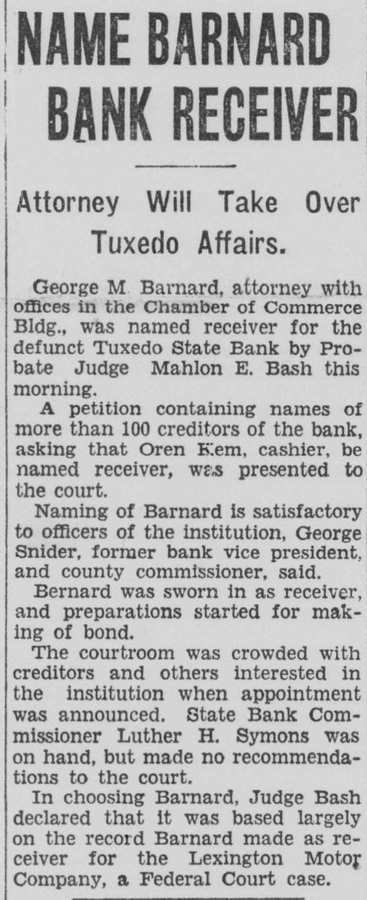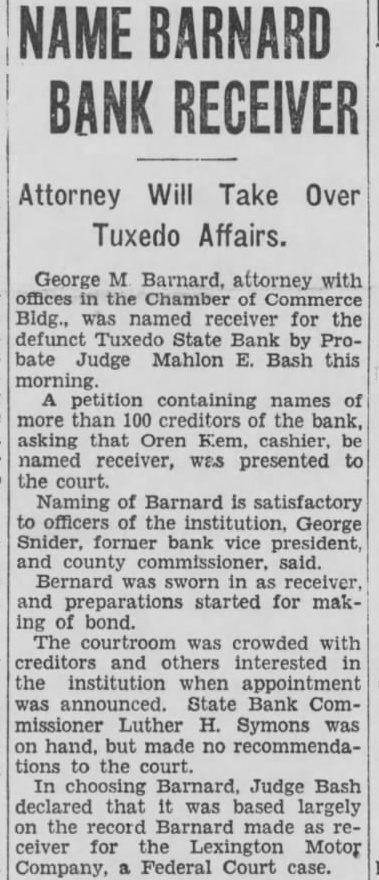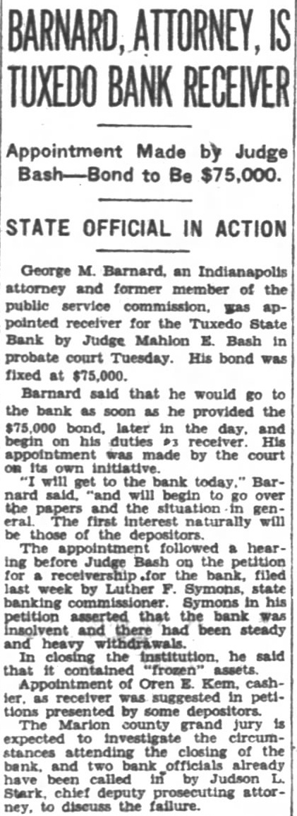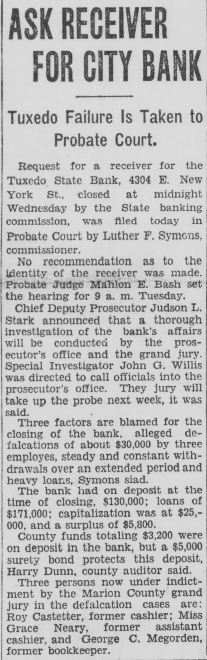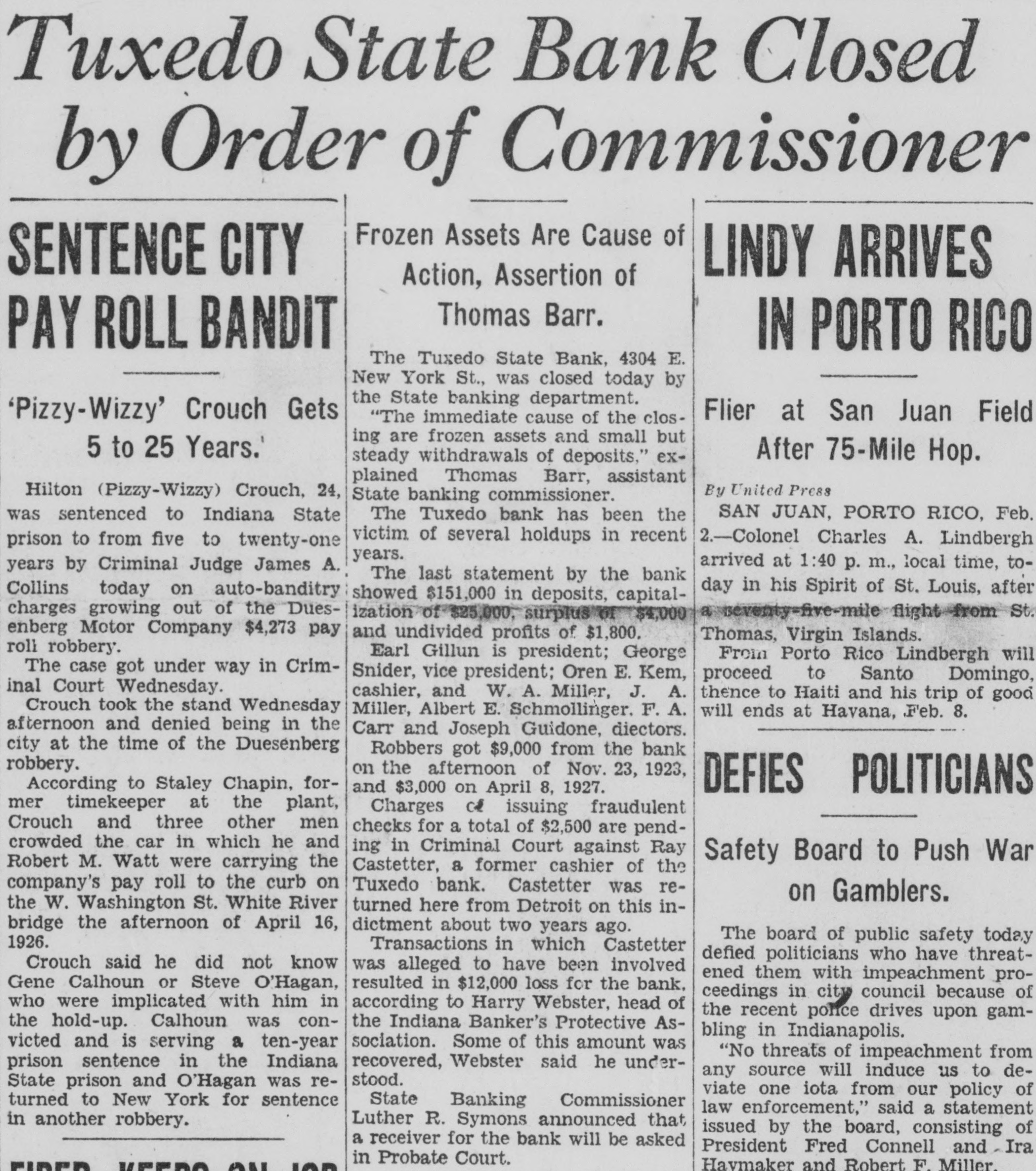 Tuxedo State Bank Closed by Order of Commissioner Frozen Assets Are Cause of SENTENCE CITY LINDY ARRIVES Action, Assertion of Thomas Barr. PAY ROLL BANDIT IN PORTO RICO The Tuxedo State Bank, 4304 E. New York St., was closed today by the State banking department. Flier at San Juan Field "The immediate cause of the clos'Pizzy-Wizzy' Crouch Gets ing are frozen assets and small but 5 to 25 Years. steady withdrawals of deposits," exAfter 75-Mile Hop. plained Thomas Barr, assistant By United Press Hilton (Pizzy-Wizzy) Crouch, 24, State banking commissioner. The Tuxedo bank has been the was sentenced to Indiana State SAN JUAN, PORTO RICO, Feb. victim of several holdups in recent 2.-Colonel Charles A. Lindbergh prison to from five to twenty-one years. arrived at 1:40 p. m., local time, toyears by Criminal Judge James A. The last statement by the bank day in his Spirit of St. Louis, after Collins today on auto-banditry showed $151,000 in deposits, capitalcharges growing out of the Duesa seventy=five-mile flight from St. ization of $25,000, surplus of $4,000 enberg Motor Company $4,273 pay and undivided profits of $1,800. Thomas, Virgin Islands. roll robbery. Earl Gillun is president; George From Porto Rico Lindbergh will The case got under way in CrimSnider, vice president; Oren E. Kem, proceed to Santo Domingo, inal Court Wednesday. cashier, and W. A. Miller, J. A. thence to Haiti and his trip of good Crouch took the stand Wednesday Miller, Albert E. Schmollinger. F. A. will ends at Havana, Feb. 8. afternoon and denied being in the Carr and Joseph Guidone, diectors. city at the time of the Duesenberg Robbers got $9,000 from the bank robbery. on the afternoon of Nov. 23, 1923, According to Staley Chapin, forDEFIES POLITICIANS and $3,000 on April 8, 1927. mer timekeeper at the plant, Charges ct issuing fraudulent Crouch and three other men checks for a total of $2,500 are pendcrowded the car in which he and ing in Criminal Court against Ray Safety Board to Push War Robert M. Watt were carrying the Castetter, a former cashier of the company's pay roll to the curb on Tuxedo bank. Castetter was reon Gamblers. the W. Washington St. White River turned here from Detroit on this inbridge the afternoon of April 16, dictment about two years ago. The board of public safety today 1926. Transactions in which Castetter defied politicians who have threatCrouch said he did not know was alleged to have been involved ened them with impeachment proGene Calhoun or Steve O'Hagan, resulted in $12,000 loss for the bank. ceedings in cit council because of who were implicated with him in according to Harry Webster, head of the recent police drives upon gamthe Indiana Banker's Protective Asthe hold-up. Calhoun was conbling in Indianapolis. sociation. Some of this amount was victed and is serving a ten-year "No threats of impeachment from recovered, Webster said he underprison sentence in the Indiana any source will induce us to destood. State prison and O'Hagan was reviate one iota from our policy of turned to New York for sentence State Banking Commissioner law enforcement," said a statement in another robbery. Luther R. Symons announced that issued by the board, consisting of a receiver for the bank will be asked President Fred Connell and - Ira in Probate Court. Haymaker and Robert F. Miller.