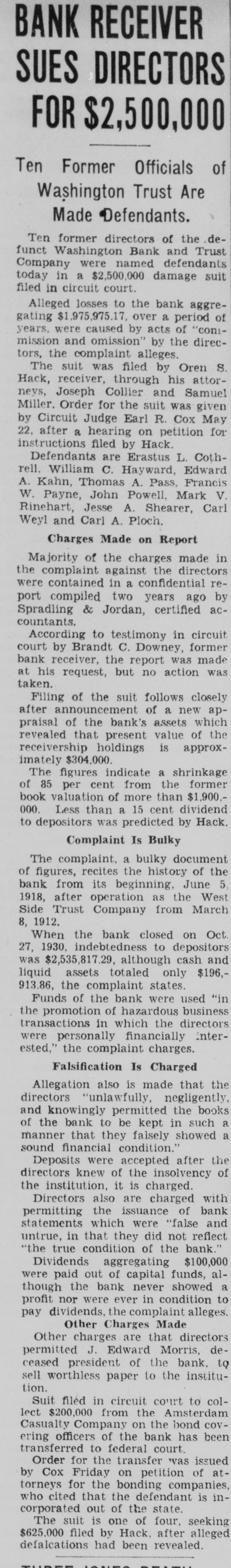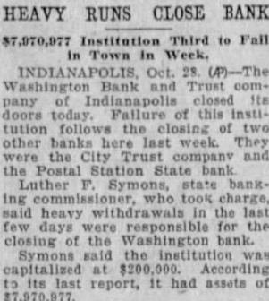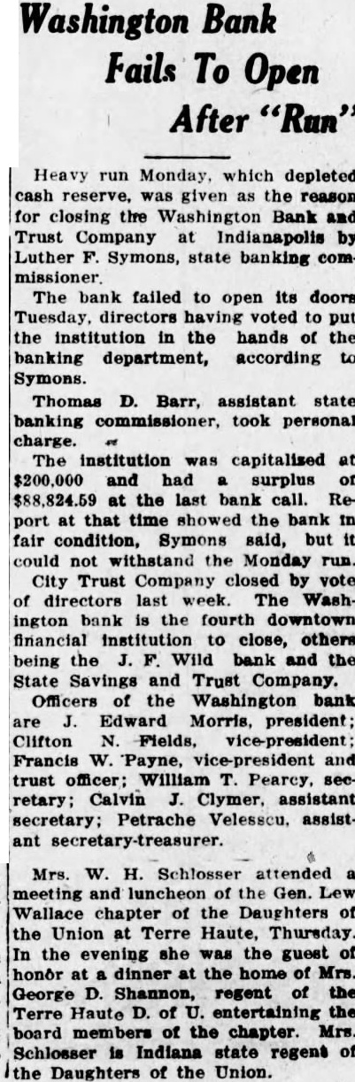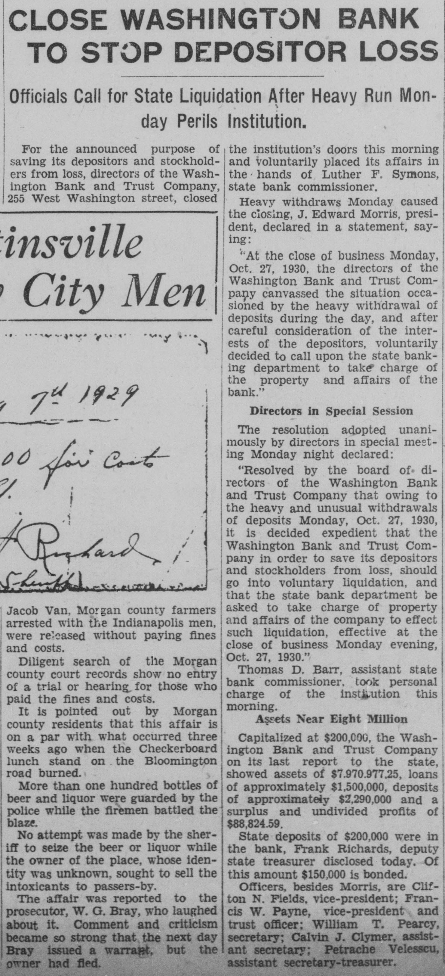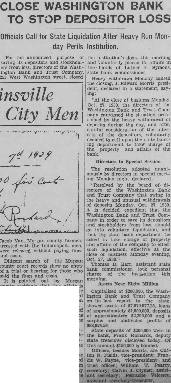 CLOSE WASHINGTON BANK TO STOP DEPOSITOR LOSS Officials Call for State Liquidation After Heavy Run Monday Perils Institution. For the announced purpose of the institution's doors this morning saving its depositors and stockholdand voluntarily placed its affairs in ers from loss, directors of the Washthe hands of Luther F. Symons, state bank commissioner. ington Bank and Trust Company, 255 West Washington street, closed Heavy withdraws Monday caused the closing, J. Edward Morris, president, declared in a statement, saying: insville "At the close of business Monday, Oct. 27, 1930, the directors of the Washington Bank and Trust Company canvassed the situation occasioned by the heavy withdrawal of City Men deposits during the day, and after careful consideration of the interests of the depositors, voluntarily decided to call upon the state banking department to take charge of the property and affairs of the bank." 7th 1929 Directors in Special Session The resolution adopted unanimously by directors in special meeting Monday night declared: "Resolved by the board of directors of the Washington Bank for Cost and Trust Company that owing to the heavy and unusual withdrawals of deposits Monday, Oct. 27, 1930, it is decided expedient that the Washington Bank and Trust Company in order to save its depositors and stockholders from loss, should Rishard go into voluntary liquidation, and that the state bank department be asked to take charge of property Jacob Van, Morgan county farmers and affairs of the company to effect arrested with the Indianapolis men, such liquidation, effective at the were released without paying fines close of business Monday evening, and costs. Oct. 27, 1930." Diligent search of the Morgan Thomas D. Barr, assistant state county court records show no entry bank commissioner, took personal of a trial or hearing for those who charge of the institution this paid the fines and costs. morning. It is pointed out by Morgan Assets Near Eight Million county residents that this affair is on a par with what occurred three Capitalized at $200,000, the Washweeks ago when the Checkerboard ington Bank and Trust Company lunch stand on the Bloomington on its last report to the state, road burned. showed assets of $7.970.977,25, loans More than one hundred bottles of of approximately $1,500,000, deposits beer and liquor were guarded by the of approximately $2,290,000 and a police while the firemen battled the surplus and undivided profits of blaze. $88,824.59. No attempt was made by the sherState deposits of $200,000 were in iff to seize the beer or liquor while the bank, Frank Richards, deputy the owner of the place, whose idenstate treasurer disclosed today. Of tity was unknown, sought to sell the this amount $150,000 is bonded. Officers, besides Morris, are Clifintoxicants to passers-by. ton N. Fields, vice-president; FranThe affair was reported to the prosecutor, W. G. Bray, who laughed cis W. Payne, vice-president and trust officer: William T. Pearcy, about it. Comment and criticism secretary; Calvin J. Clymer, assistbecame so strong that the next day ant secretary; Petrache Velesscu, Bray issued a warrant, but the assistant secretary-treasurer. owner had fled.
