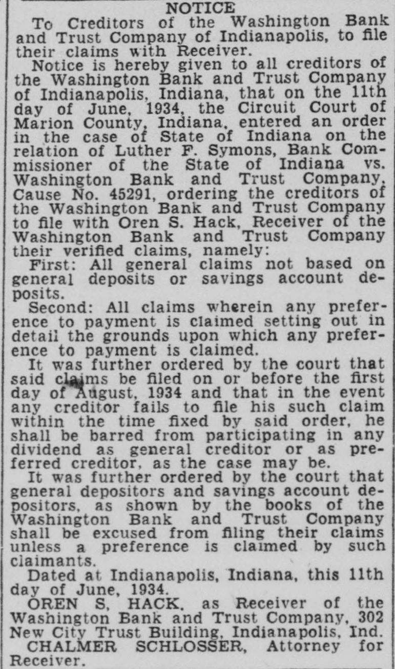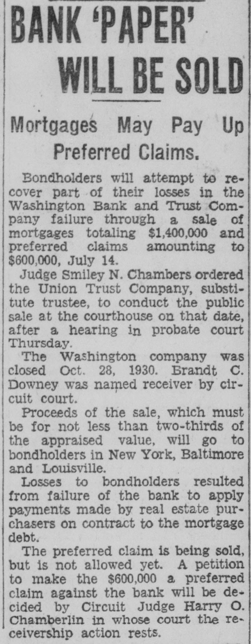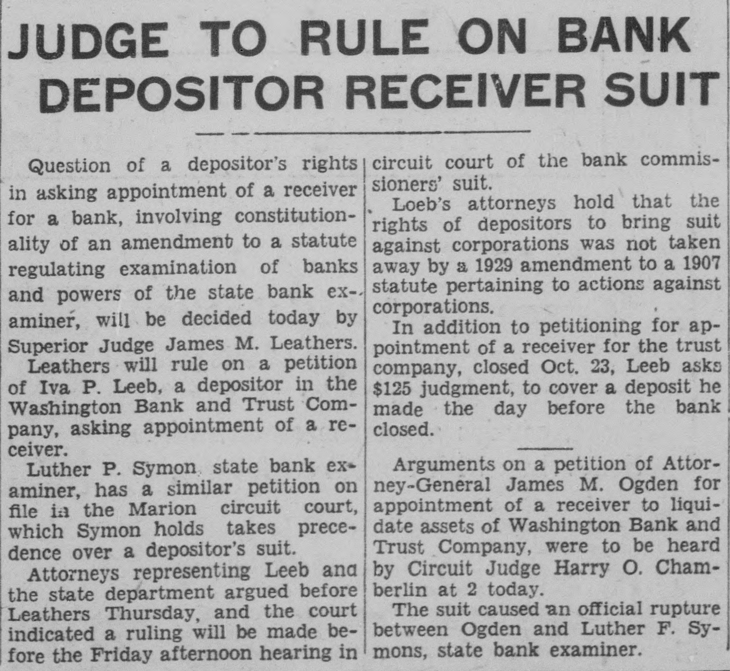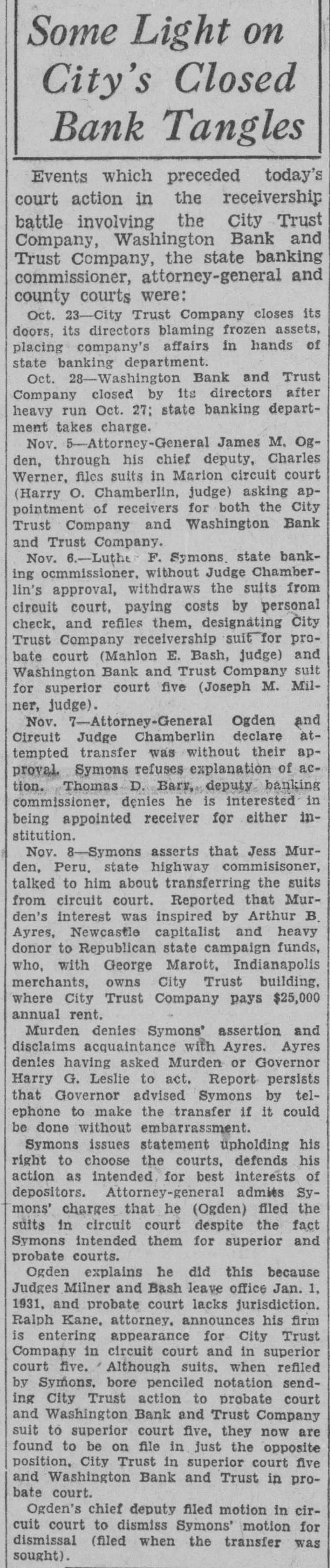CLOSE WASHINGTON BANK TO STOP DEPOSITOR LOSS Officials Call for State Liquidation After Heavy Run Monday Perils Institution. For the announced purpose of the institution's doors this morning saving its depositors and stockholdand voluntarily placed its affairs in ers from loss, directors of the Washthe hands of Luther F. Symons, state bank commissioner. ington Bank and Trust Company, 255 West Washington street, closed Heavy withdraws Monday caused the closing, J. Edward Morris, president, declared in a statement, saying: insville "At the close of business Monday, Oct. 27, 1930, the directors of the Washington Bank and Trust Company canvassed the situation occasioned by the heavy withdrawal of City Men deposits during the day, and after careful consideration of the interests of the depositors, voluntarily decided to call upon the state banking department to take charge of the property and affairs of the bank." 7th 1929 Directors in Special Session The resolution adopted unanimously by directors in special meeting Monday night declared: "Resolved by the board of directors of the Washington Bank for Cost and Trust Company that owing to the heavy and unusual withdrawals of deposits Monday, Oct. 27, 1930, it is decided expedient that the Washington Bank and Trust Company in order to save its depositors and stockholders from loss, should Rishard go into voluntary liquidation, and that the state bank department be asked to take charge of property Jacob Van, Morgan county farmers and affairs of the company to effect arrested with the Indianapolis men, such liquidation, effective at the were released without paying fines close of business Monday evening, and costs. Oct. 27, 1930." Diligent search of the Morgan Thomas D. Barr, assistant state county court records show no entry bank commissioner, took personal of a trial or hearing for those who charge of the institution this paid the fines and costs. morning. It is pointed out by Morgan Assets Near Eight Million county residents that this affair is on a par with what occurred three Capitalized at $200,000, the Washweeks ago when the Checkerboard ington Bank and Trust Company lunch stand on the Bloomington on its last report to the state, road burned. showed assets of $7.970.977,25, loans More than one hundred bottles of of approximately $1,500,000, deposits beer and liquor were guarded by the of approximately $2,290,000 and a police while the firemen battled the surplus and undivided profits of blaze. $88,824.59. No attempt was made by the sherState deposits of $200,000 were in iff to seize the beer or liquor while the bank, Frank Richards, deputy the owner of the place, whose idenstate treasurer disclosed today. Of tity was unknown, sought to sell the this amount $150,000 is bonded. Officers, besides Morris, are Clifintoxicants to passers-by. ton N. Fields, vice-president; FranThe affair was reported to the prosecutor, W. G. Bray, who laughed cis W. Payne, vice-president and trust officer: William T. Pearcy, about it. Comment and criticism secretary; Calvin J. Clymer, assistbecame so strong that the next day ant secretary; Petrache Velesscu, Bray issued a warrant, but the assistant secretary-treasurer. owner had fled.