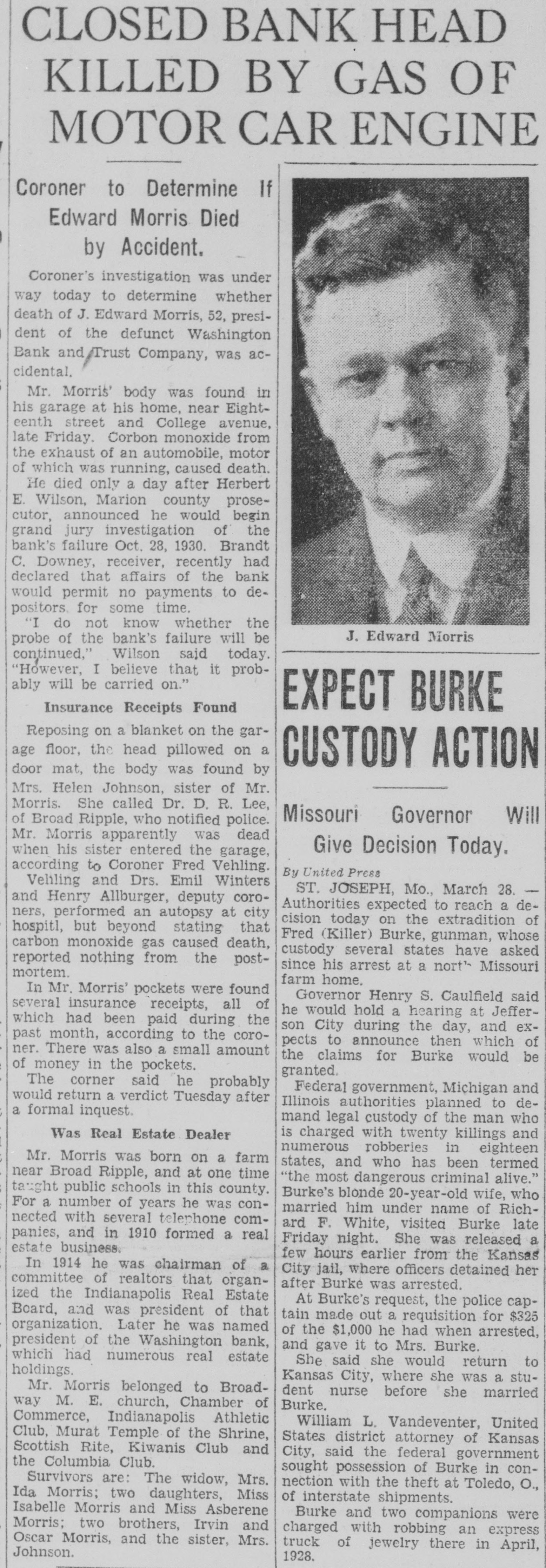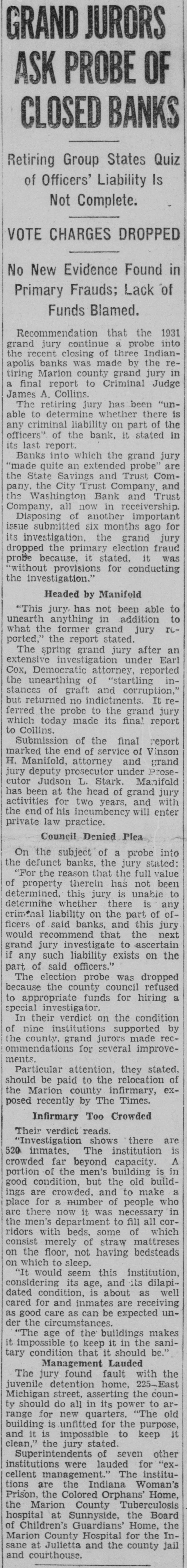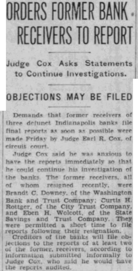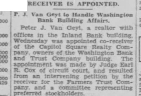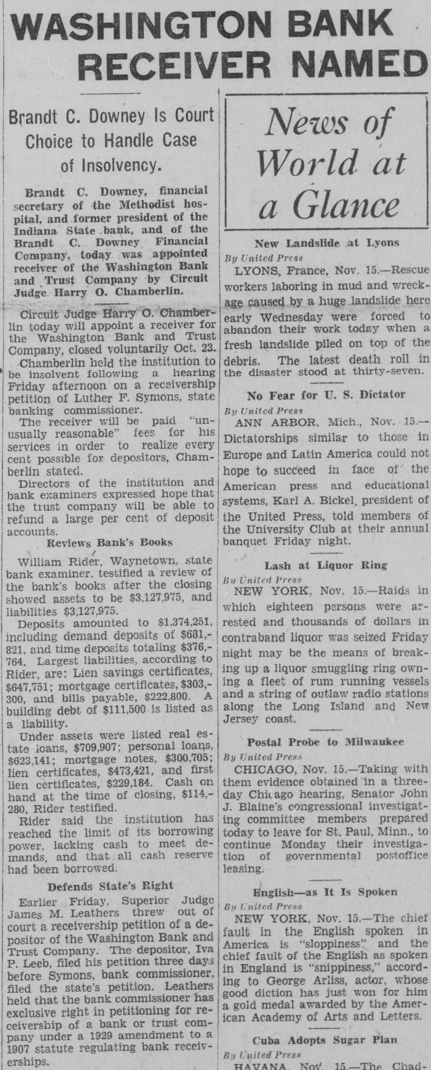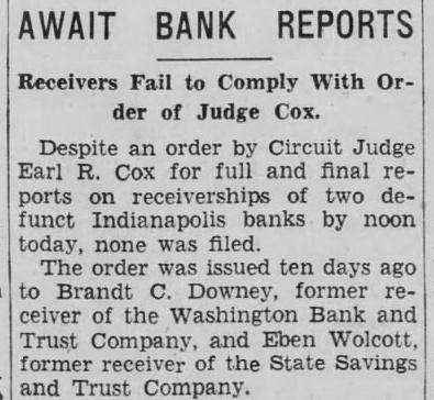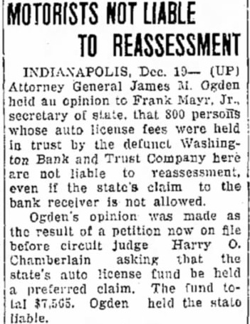 CLOSE WASHINGTON BANK TO STOP DEPOSITOR LOSS Officials Call for State Liquidation After Heavy Run Monday Perils Institution. For the announced purpose of the institution's doors this morning saving its depositors and stockholdand voluntarily placed its affairs in ers from loss, directors of the Washthe hands of Luther F. Symons, state bank commissioner. ington Bank and Trust Company, 255 West Washington street, closed Heavy withdraws Monday caused the closing, J. Edward Morris, president, declared in a statement, saying: insville "At the close of business Monday, Oct. 27, 1930, the directors of the Washington Bank and Trust Company canvassed the situation occasioned by the heavy withdrawal of City Men deposits during the day, and after careful consideration of the interests of the depositors, voluntarily decided to call upon the state banking department to take charge of the property and affairs of the bank." 7th 1929 Directors in Special Session The resolution adopted unanimously by directors in special meeting Monday night declared: "Resolved by the board of directors of the Washington Bank for Cost and Trust Company that owing to the heavy and unusual withdrawals of deposits Monday, Oct. 27, 1930, it is decided expedient that the Washington Bank and Trust Company in order to save its depositors and stockholders from loss, should Rishard go into voluntary liquidation, and that the state bank department be asked to take charge of property Jacob Van, Morgan county farmers and affairs of the company to effect arrested with the Indianapolis men, such liquidation, effective at the were released without paying fines close of business Monday evening, and costs. Oct. 27, 1930." Diligent search of the Morgan Thomas D. Barr, assistant state county court records show no entry bank commissioner, took personal of a trial or hearing for those who charge of the institution this paid the fines and costs. morning. It is pointed out by Morgan Assets Near Eight Million county residents that this affair is on a par with what occurred three Capitalized at $200,000, the Washweeks ago when the Checkerboard ington Bank and Trust Company lunch stand on the Bloomington on its last report to the state, road burned. showed assets of $7.970.977,25, loans More than one hundred bottles of of approximately $1,500,000, deposits beer and liquor were guarded by the of approximately $2,290,000 and a police while the firemen battled the surplus and undivided profits of blaze. $88,824.59. No attempt was made by the sherState deposits of $200,000 were in iff to seize the beer or liquor while the bank, Frank Richards, deputy the owner of the place, whose idenstate treasurer disclosed today. Of tity was unknown, sought to sell the this amount $150,000 is bonded. Officers, besides Morris, are Clifintoxicants to passers-by. ton N. Fields, vice-president; FranThe affair was reported to the prosecutor, W. G. Bray, who laughed cis W. Payne, vice-president and trust officer: William T. Pearcy, about it. Comment and criticism secretary; Calvin J. Clymer, assistbecame so strong that the next day ant secretary; Petrache Velesscu, Bray issued a warrant, but the assistant secretary-treasurer. owner had fled.