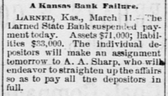 South and West. THE Larned State Bank, of Larned, Kan., has suspended payment. The assets are $71,000, and the liabilities $33,000. FRANK MILLER was instantly killed and Alfred Westergren had his skull crushed by the fall of a derrick at Ortonville, South Dakota. THE Chicago, Burlington and Northern Railroad has been bought by the Chicago Burlington and Quincy. DAVID MCGREW, pastor of the colored Baptist Church at Armstrong, Mo.; Andrew Begman, and Will Jackson, all colored, were run over by the Union Pacific train and killed. Six prisoners have escaped from the county jail at Eau Claire, Wis. They wereall burglars. THE trial in San Francisco of Mrs. Sarah Althea Terry for resisting the United States Marshal has concluded. The jury failed to agree on a verdict. THE lower Mississippi has overflowed its banks in many places, causing much damage. JUDGE ANDREW J. DAVIS, Montana's richest citizen. has just died, leaving an estate valued from $6,000,000 to $10,000,000. A MYSTERIOUS malady, believed to be spotted fever, is prevailing in Jefferson County, Tenn. The contagion has broken out in Carson College. Four deaths have occurred. VERNON HAY and George Pollard, two runaway pupils from the Illinois State Institution for Deaf Mutes, were run over by a train at Jacksonville, Ill. Hay was killed and Pollard severely hurt. HENRY NURRE, a farmer of Clinton County, Iowa, was found murdered in his house and his wife seriously wounded. The murderer is not known. SPECIAL PENSION EXAMINER REIGART'S friends: Maysville, Ky., gave him a banquet on the occasion of the anniversary of his accession to office. Upon taking his first mouthful of food he was seized with violent coughing and was strangled to death by a piece of meat which had lodged in his windpipe. THE L. Banerle Company's woodenware factory at Petoskey, Mich., has been burned. Loss, $100,000. THE machine shops of the Hocking Valley Railroad were burned at Columbus, Ohio, with a loss of $150,000. ANDREW A. HOLT, a noted smuggler and pirate on Puget Sound, was fatally shot on his sloop near Seattle, Wash., while resisting arrest. FRANK M. LEGGETT and William L. Crockett were instantly killed and Arch Ure fatally hurt by the falling of a cage in a coal mine at Alma, Kan. Two men were instantly killed by a landslide near Charleston, W. Va. "BoB" RAINES. a white man, was hanged at Somerville, Ala., for the murder of his brother, the Rev. George Raines, pastor of a Baptist church. THE Victoria sealing fleet has resumed its poaching operations in the North Pacific. A FIRE starting from an overturned stove in B. T. Tawkins's dry goods store at Kirkville, Mo., destroyed that building, the First National Bank building and several other business structures. The total loss is $200,000. GABRIEL, a Mission Indian, who was 150 years old, has died at the Monterey County Poorhouse, Cal. THE Utah Legislature passed a memorial to Congress censuring the Governor for vetoing election bills, and asking Congress to enact the vetoed measures. A TRAIN struck the team of Henry Boes, at Holland, Mich.. killing Boes instantly and fatally injuring his wife.