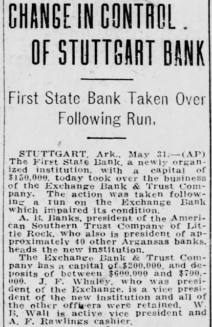 CHANGE IN CONTROL OF STUTTGART BANK First State Bank Taken Over Following Run. May First capital today took the of the Bank Trust Company. taken followrun the Exchange Bank which impaired B. president of the American Southern Trust of other Argansas heads the The Exchange Trust Comand presithe Exchange. and all of officers were retained. Wall active president and