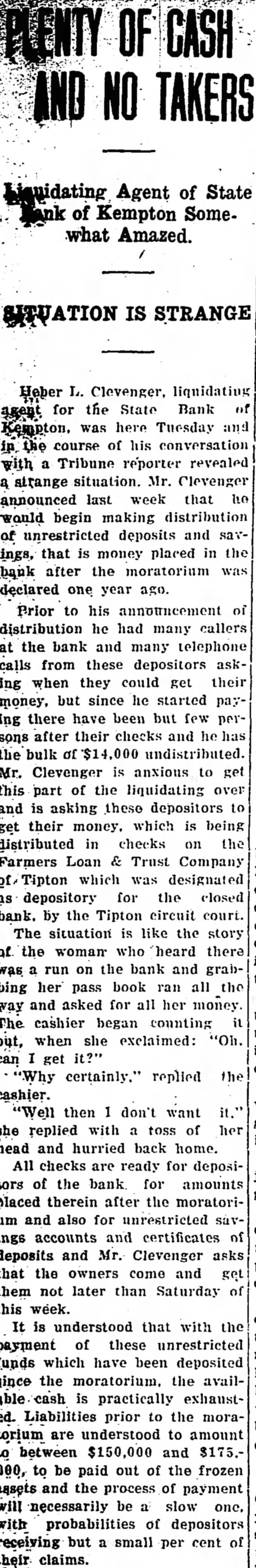 PLENTY OF CASH AND NO TAKERS Liquidating Agent of State of Kempton Somewhat Amazed. SITUATION IS STRANGE Heber L. Clevenger, liquidating agent for the State Bank of Kempton, was here Tuesday and in the course of his conversation with a Tribune réporter revealed a sirange situation. Mr. Clevenger announced last week that he would begin making distribution of unrestricted deposits and savings, that is money placed in the bank after the moratorium was declared one year ago. Prior to his announcement of distribution he had many callers at the bank and many telephone calls from these depositors asking when they could get their money, but since he started paying there have been but few persons after their checks and he has the bulk of $14,000 undistributed. Mr. Clevenger is anxious to get this part of the liquidating over and is asking these depositors to get their money. which is being distributed in checks on the Farmers Loan & Trust Company of Tipton which was designated as depository for the closed bank. by the Tipton circuit court. The situation is like the story of the woman who heard there was a run on the bank and grabbing her pass book ran all the way and asked for all her money. The cashier began counting it out, when she exclaimed: "Oh. can I get it?" "Why certainly." replied the cashier. "Well then 1 don't want it." she replied with a toss of her head and hurried back home. All checks are ready for deposilors of the bank for amounts placed therein after the moratorium and also for unrestricted savings accounts and certificates of deposits and Mr. Clevenger asks that the owners come and get them not later than Saturday of this week. It is understood that with the payment of these unrestricted funds which have been deposited since the moratorium, the available cash is practically exhausted. Liabilities prior to the moratorium are understood to amount to between $150,000 and $175.000, to be paid out of the frozen assets and the process of payment will necessarily be a slow one, with probabilities of depositors receiving but a small per cent of their claims.