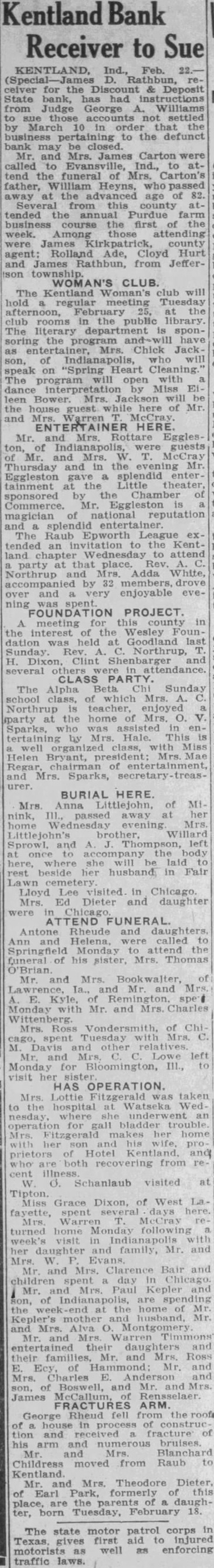 Kentland Bank Receiver to Sue KENTLAND, Ind., Feb. James D. Rathbun, receiver for the Discount & Deposit State bank, has had instructions from Judge George Williams to those accounts not settled by March 10 in order that the business pertaining to the defunct bank may be closed. Mr. and Mrs. James Carton were called Evansville, Ind., to attend the funeral of Mrs. Carton's father, Heyns, who passed away at the advanced age of 82. Several from this county tended the annual Purdue farm business course the first of the week. Among those attending were James Kirkpatrick, county agent: Rolland Ade, Cloyd Hurt and James Rathbun, from Jeffertownship. WOMAN'S CLUB. The Kentland Woman's club will hold regular meeting Tuesday February at the club rooms in the public library The literary department sponsoring the program and-will have as entertainer, Mrs. Chick Jackson, of Indianapolis, speak on "Spring Heart Cleaning The program will open with dance by Miss Elleen Bower. Mrs. Jackson will the house guest here of Mr and Mrs. Warren McCray ENTERTAINER HERE. Mr. and Mrs. ton, of guests of and Mrs. W McCray Thursday in the evening Mr. Eggleston gave splendid enter tainment at the Little theater, sponsored the Chamber of Commerce. Mr. Eggleston is magician of national reputation and a entertainer. The Raub Epworth League extended an invitation to the Kentland chapter Wednesday to attend party at that place. Rev. Northrup and Mrs. Adda White, accompanied by 32 drove over and a very enjoyable evening was FOUNDATION PROJECT. A meeting for this county in the interest of the Wesley Foundation was held at Goodland last Sunday Rev. Northrup, H. Dixon, Clint Shenbarger and attendance CLASS PARTY. The Alpha Sunday school class, of which Mrs. Northrup is teacher, enjoyed sparty at the home of Mrs. O. V. Sparks, in entertaining by Mrs. Hale. This is well organized class, with Miss Helen Bryant, president: Mrs. Mae Regar, chairman of entertainment, and Mrs. Sparks, urer. BURIAL HERE. Mrs. Anna of nink, III., passed away at her home Wednesday evening Mrs. Littlejohn's Willard Sprowl, and J. Thompson, left once to accompany the body here, where she laid rest beside her husband in Fair Lloyd Lee visited in Chicago. Mrs. Ed Dieter and daughter Chicago ATTEND FUNERAL. Antone Rheude and Helena, were called to Ann Springfield Monday attend the funeral of his sister, Mrs. Thomas Mr. and Mrs. Bookwalter, of and Mr and Mrs Monday with Mr. and Mrs. Charles Wittenberg. Mrs. Ross of spent Tuesday with Mrs. C. Davis and other relatives. Mr. and Mrs. Lowe left Monday for Bloomington, III., to visit her HAS OPERATION. Mrs. Lottie Fitzgerald was taken to the hospital at Watseka Wed. where she an operation for gall bladder trouble Mrs. Fitzgerald her home her his proprietors of Hotel Kentland, and who are both recovering from recent illness W O. Schanlaub visited at Miss Grace Dixon, of West Lafayette, spent days here. Mrs. Warren McCray turned home Monday following visit in Indianapolis with her daughter and family, Mr. and Mrs. W Evans. Mr. and Mrs. Clarence Bair and children spent day in Chicago. Mr. Mrs. Paul Kepler and son, of are spending the week-end at the home of mother husband, Mr. Kepler's and Mrs. Alva O. Montgomery Mr. and Mrs. Warren entertained their daughters and their families, Mr. and Mrs. Ross E. Ecy of Hammond: Mr. and Mrs. Charles E. Anderson and son, of Boswell, and Mr. and Mrs. James McCallum, FRACTURES ARM George Rheud fell from the roofs of in of tion and received fracture of his arm and numerous bruises. Mr. and Mrs. Blanchard Childress moved from Raub to Kentland Mr. and Mrs. Theodore Dieter, of Earl Park, formerly of this place, are the parents of daughter, born Tuesday, February 18. The state motor patrol corps in Texas. gives first aid to injured motorists as well as enforcing traffic laws.