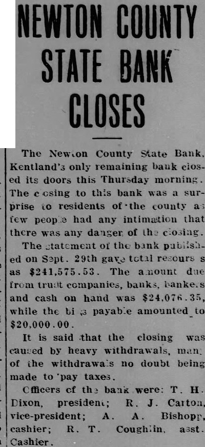 NEWTON COUNTY STATE BANK CLOSES The Newton County State Bank, Kentland's only remaining bank closed its doors this Thursday morning The osing to this bank was a surprise to residents of the county as few people had any intimation that there was any danger of the closing. The statement of the bank published on Sept. 29th gave total resours S as $241,575 53. The amount due from trust companies, banks, bankers and cash on hand was $24,076 35, while the bi 3 payable amounted to $20,000.00 It is said that the closing was caused by heavy withdrawals, man of the withdrawals no doubt being made to pay taxes. Officers of the bank were: T. H Dixon, president; R. J. Carton, vice-president; A. A. Bishopp, cashier; R. T. Coughlin asst. Cashier.