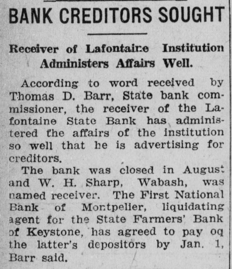 BANK CREDITORS SOUGHT Receiver of Lafontaire Institution Administers Affairs Well. According to word received by Thomas D. Barr, State bank commissioner, the receiver of the Lafontaine State Bank has administered the affairs of the institution so well that he is advertising for creditors. The bank was closed in August and W. H. Sharp, Wabash, was named receiver. The First National Bank of Montpelier, liquidating agent for the State Farmers' Bank of Keystone, has agreed to pay oq the latter's depositors by Jan. 1, Barr said.