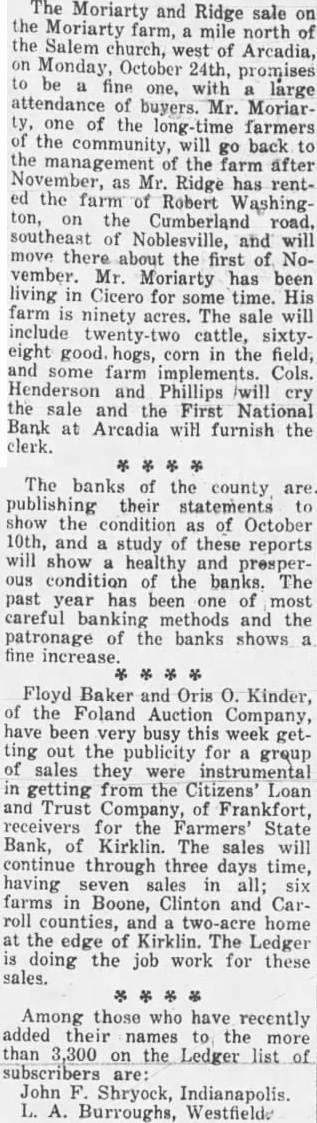 The Moriarty and Ridge sale the Moriarty farm, mile north the Salem church, west of Arcadia, Monday, October 24th, promises fine one, with large attendance buyers. Moriarone the farmers the community, will back to management of the farm after November, as Mr. Ridge has rentthe farm Robert Washingthe Cumberland road, southeast of will move the first of November. Mr. has been living in Cicero for some time. His farm ninety acres. The sale will include cattle, sixtyeight hogs, corn in the field, some farm implements. Cols. cry the and the First National Bank Arcadia will furnish the clerk. The banks of the county publishing their statements the condition of October 10th, and study these reports show healthy and presperous condition of the banks. The past year been of most careful banking methods and the patronage of the banks shows increase Floyd Baker and Kinder, the Foland Auction Company, have been very busy this week getting out the publicity for group sales they were instrumental getting from the Trust Company, of Frankfort, receivers the Farmers' State Bank, Kirklin. The sales will continue through three days time, having all; six farms in Boone, Clinton and Carroll home the edge of Kirklin. The Ledger doing the work for these sales. Among those who have recently added their the names more than 3,300 the Ledger subscribers John Shryock, Indianapolis. Burroughs, Westfield