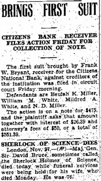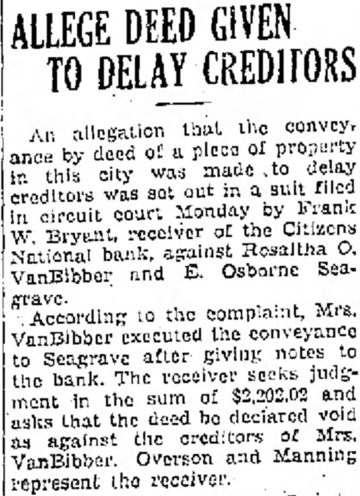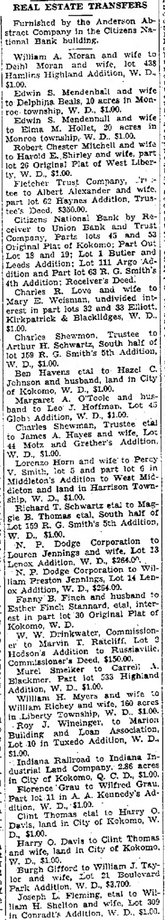 William A. Moran and wife to wife, lot 438 Hamlins Highland Addition, W. D., Edwin S. Mendenball and wife 10 acres in MonDelphina township. W. D., $1.00. Edwin Mendennall and wife to Elma M. Hollet, 20 acres in Monroe township, W. D.. Robert Mitchell and wife to Harold E. Shirley and wife, part of West Liber26 Original Plat Fletcher Trust Company, Albert Alexander to Addition, Trus62 Haynes part Citizens National Bank by Receiver to Union Bank and Trust Parts lots and Part Out Original Plat Lot Butler and Lot 18 and 19; Lot 111 Argo AdLeeds Addition: Smith's dition and Part 4th Addition: Receiver's Deed. wife to Love and Mary Charles E. Weisman, undivided Elliott. intlots 32 and 33 part Kirkpatrick erest & Blacklidges, W. D., Charles Shewmon. Trustee t.o Arthur H. Schwartz, South half of 5th Addition, Smith's 159 $1.00. Hazel C. Havens etal to Ben Johnson and husband, $1.00. land in City Kokomo, W. O'Toole and husMargaret Lot 45 Hoffman. band W. $1.00. Addition, Charles Trustee etal to James Hayes wife, Lot 44 Motz and Grether's Addition, D., $1.00. Lorenzo Horn and wife to Percy lot and part lot Smith, West MidMiddleton's Harrison Townand land in dieton W. etal to MagSouth half of B. Smith's 5th Addition, Lot 159 R. $1.00. Corporation to N. P. Dodge Lot 13 Jennings and Louren W. D., $264.00 Lenox N. Dodge Corporation to Len- WilPreston W. Addition, husband to Finch and Fanny Esther Finch Plat of lot 30 Original est in part Kokomo, CommissionDrinkwater, W. Lot to Marvin Hodson's Addition Deed. $150.00. Murel Smelker lot 533 Highland Part W. $1.00. Addition, and wife to William H. Myers 160 acres William Richey $1.00. Liberty to Marion Wineinger, Roy Loan Association, and Building W. D., Tuxedo Addition, Lot 10 in $1.00. Indiana Into Indiana 2.86 acres Land Company. dustrial D., $1.00. of Kokomo, City Wilfred Grau. Grau to Florence Kennedy's AdPart in D., $1.00 dition, to Harry Clint Kokomo, W. in City of Davis, land $1.00. Clint Thomas Davis to Harry O. In City of and wife, land D., William J. TayGifford to Burgh Lot wife, Addition. W. Park etal WilJoseph wife, Lot 309 liam H. W. $1.00. Conradt's