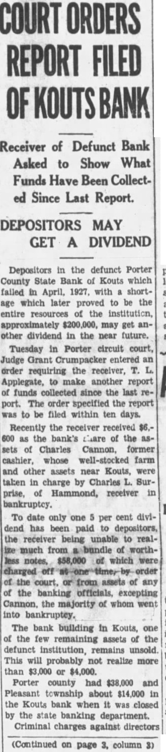 COURT ORDERS REPORT FILED OF Receiver of Defunct Bank Asked to Show What Funds Have Been Collected Since Last Report. DEPOSITORS MAY GET A DIVIDEND Depositors in the defunct Porter County State Bank of Kouts which failed in April, 1927, with shortage which later proved to be the entire resources of the institution, approximately $200,000, may get another dividend in the near future. Tuesday in Porter circuit court, Judge Grant Crumpacker entered an order requiring the receiver, T. L. Applegate, to make another report funds collected since the last report. The order specified the report was to be filed within ten days. Recently the receiver received $6.600 as the bank's Chare of the asof Charles Cannon, former cashier, whose well-stocked farm and other assets near Kouts, were taken in charge by Charles L. Surprise, of Hammond, receiver in bankruptcy. To date only one per cent dividend has been paid to depositors, the receiver being unable to realize much from bundle of worthless notes, $58,000 of which were charged order of the court, or from assets of any of the banking officials, excepting Cannon, the majority of whom went into bankruptcy. The bank building in Kouts, one of the few remaining assets of the defunct institution, remains unsold. This will probably not realize more than $3,000 or $4,000. Porter county had $38,000 and Pleasant township about $14,000 in the Kouts bank when it was closed by the state banking department. Criminal charges against directors (Continued on page 3, column 3)