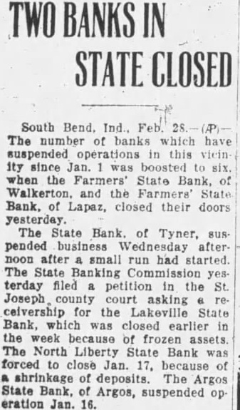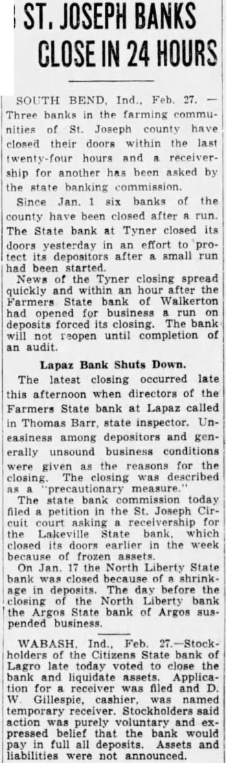 Prominent bank officials clared to-day that they are in sition to that the financial the closed institutions sound, bearing out the of state that the of deposits were absolutely the basis of the banks' books. The South Bend bankers also unteered full cooperation bring about of the small banking The banks ness Wednesday and Thursday after runs had been started deposits are the Farmers' State bank of Tyner, the Farmers' bank Lapaz the Walkerton State bank. All three their deors voluntarily after special sessions of boards of directors and state banking inspectors were called Thursday's total of banks, four Joseph three that have closed their doors in recent these. the Trust bank is the South Bend institution affected. Others North Liberty, this county, Tyner, Lapaz Argos Marshall county. Early this week the State bank business following bank officials and state banking authorities. hearing for the Lakeville bank will held before Circuit Judge Cyrus Pattee next Wednesday morning. No Danger Here. Rome Stephenson. president of the St. Joseph Loan Trust company and vice president the American Bankers' association, he expects ask State Banking Commissioner Luther Symons come to South Bend in an effort reassure the public of the stability banks in the appears that there is nothing wrong with these banks,' Mr. "and lieve we find that the boards bit hastily in ordering the with E. Miller, president of the American other announced that banks South Bend, all of which have $500,000 and 000,000 in cash hand, on beyond any possible danger. addition large the local banks hold several millions dollars in listed bonds. Secondary reserves guarantee absolute protection to positors, explained. Protect Deposits.